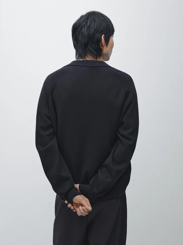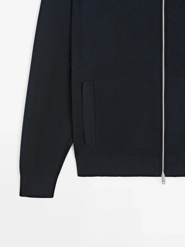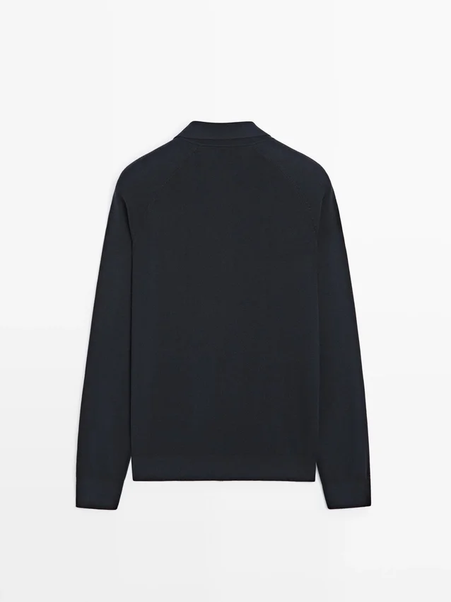 Cotton Blend Knit Cardigan. Long Sleeves. Zip Fastening. Polo Collar.