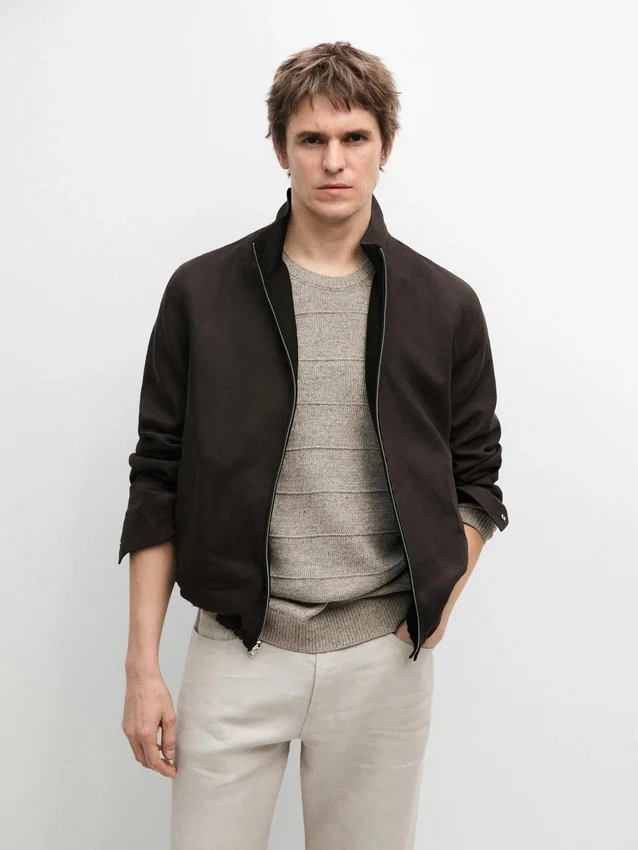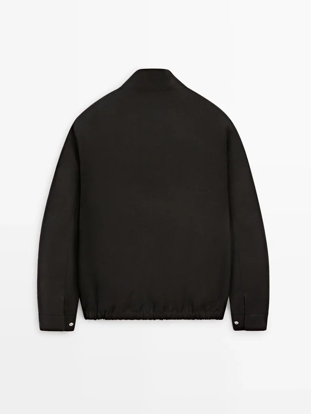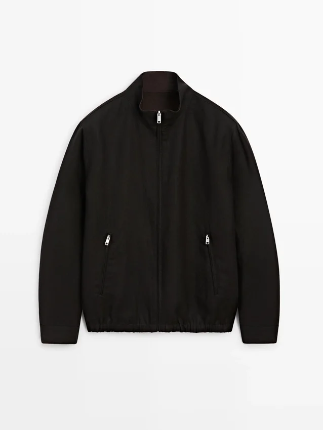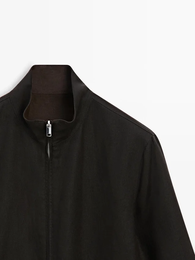 Jacket Made of 100% Linen Fabric. High Neck. Long Sleeves. Zip Fastening. Two Zipped Pockets. Elastic Band Detail at the Hem Area. Reversible Garment.