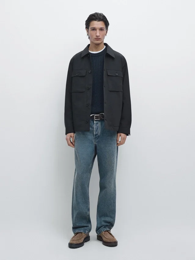 Cropped Jacket. Shirt Collar. Long Sleeves with Button Detail . Double-Breasted Button Fastening. Two Side Pockets. Two Buttoned Patch Pockets at the Chest.