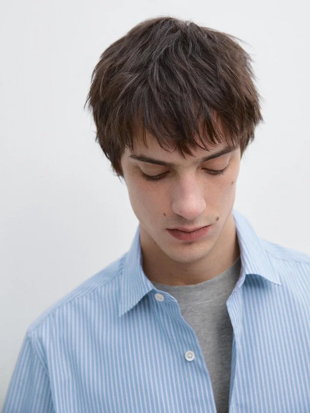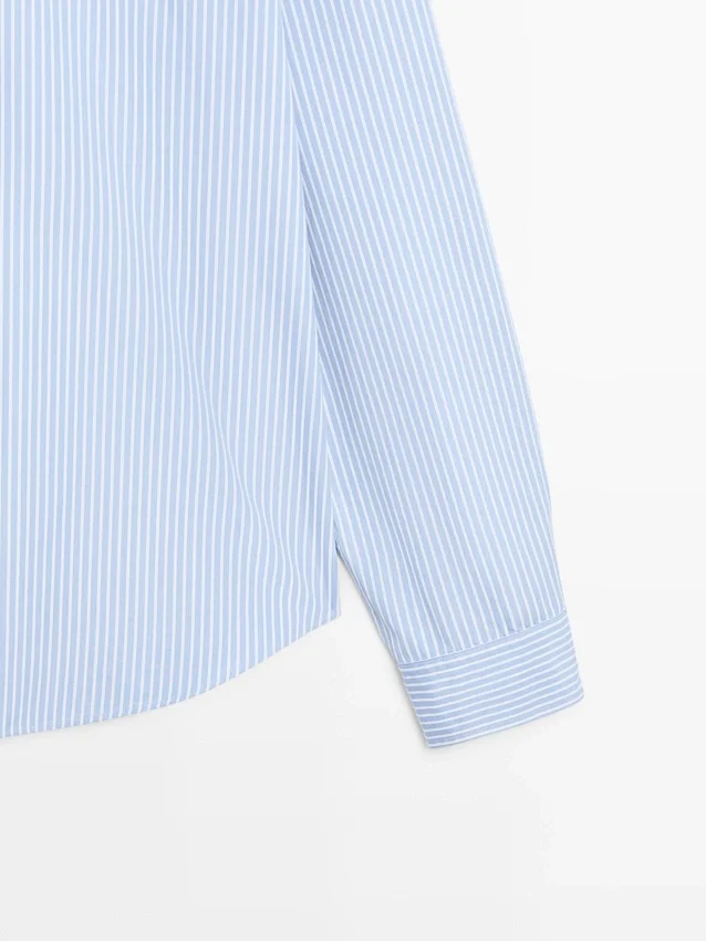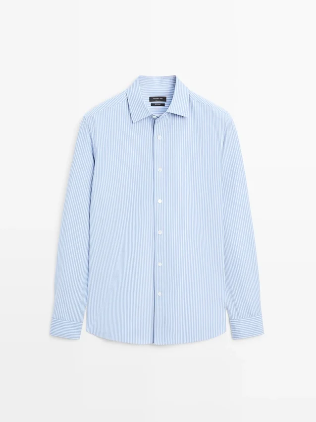 Shirt Made of a Cotton Blend Fabric. Long Sleeves with Buttoned Cuffs. Shirt Collar. Button-Up Front. Double Stripe Detail.