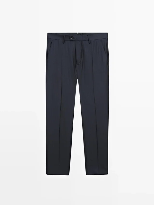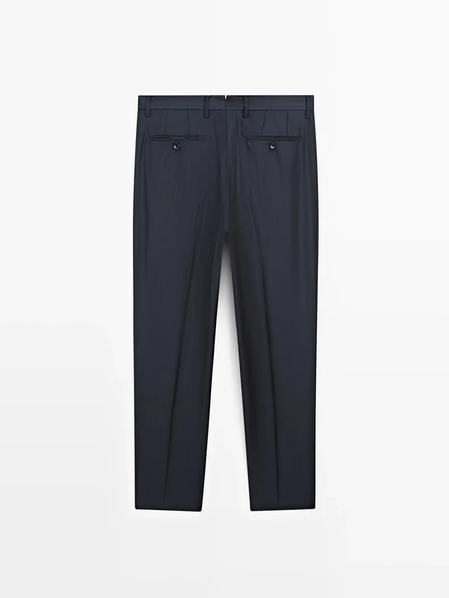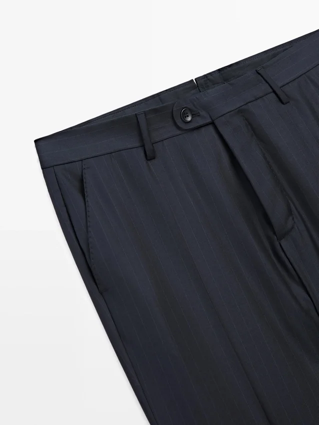 Suit Trousers Made from 100% Wool Main Fabric. Zip Fastening Concealed by a Placket, Button and Buttoned Strap. Two Side Pockets. Two Buttoned Welt Pockets on the Back. Striped Detail. Cool Wool: Lightweight, Breathable and Wrinkle-Resistant Fabric.. This Garment is Part of a Suit.