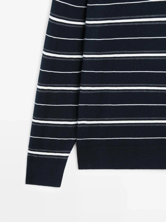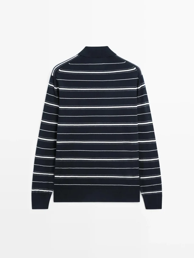 Long Sleeves. Polo Collar with Button Fastening. Striped Print.