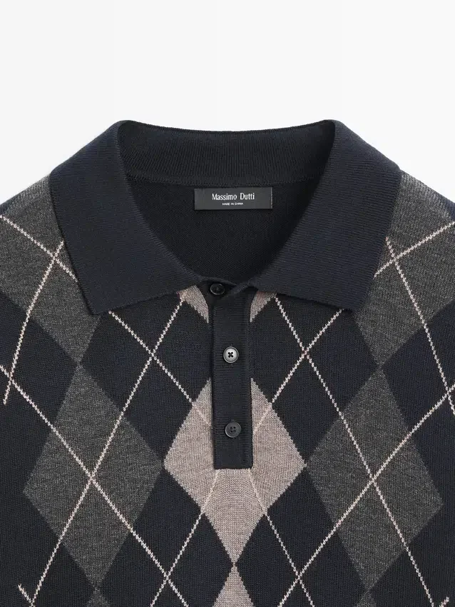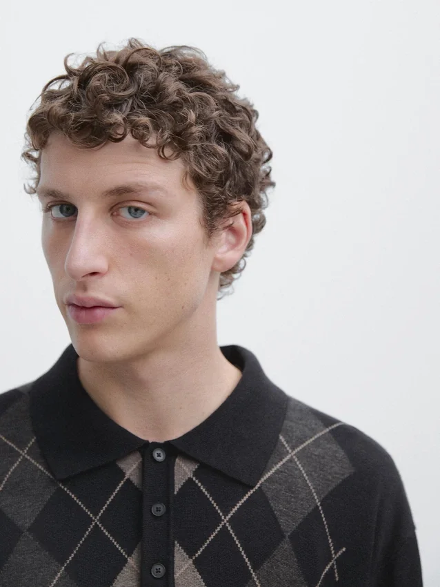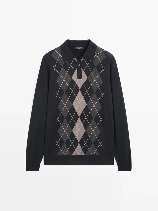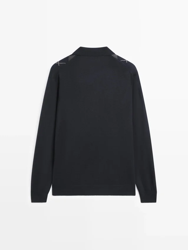 Wool Blend Knit Sweater. Long Sleeves. Detail of Ribbed Cuffs. Polo Collar with Button Fastening. Diamond Pattern Detail.