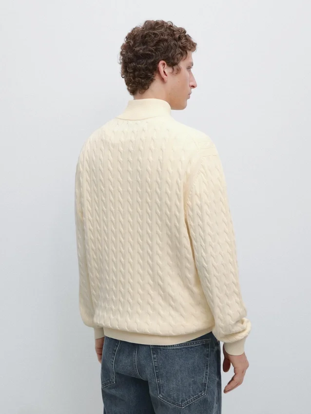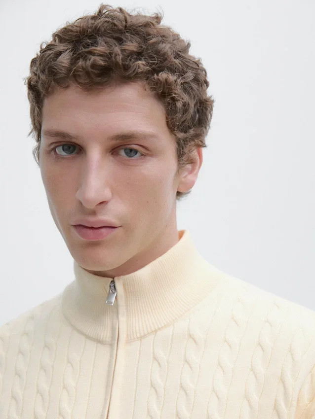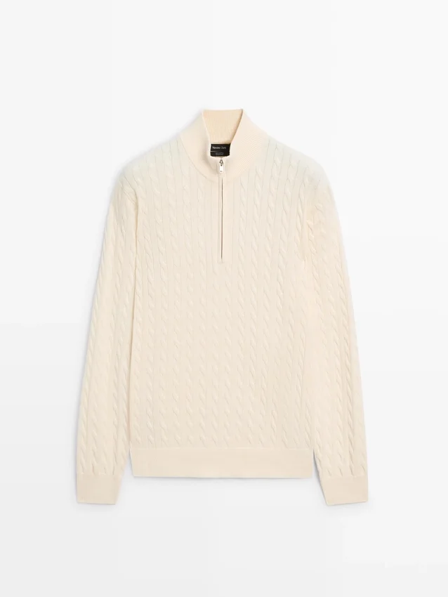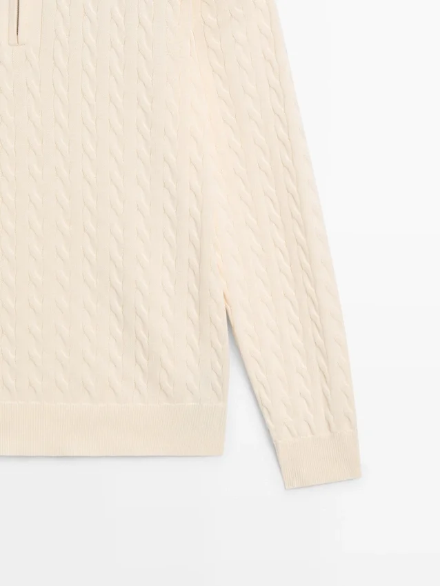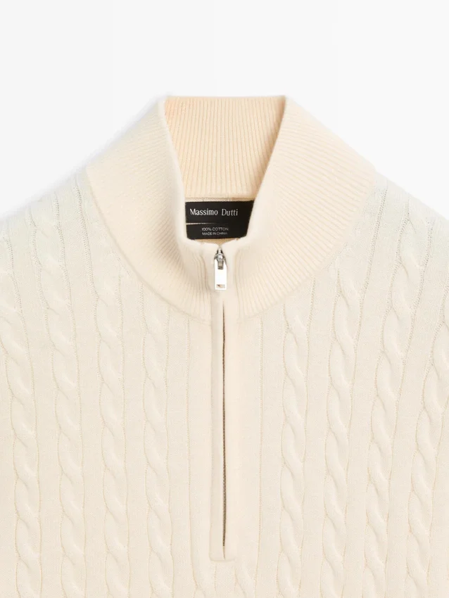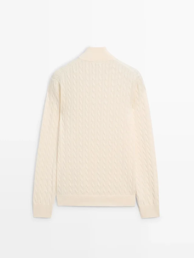 Knit Jumper Made of Cotton Fabric. Long Sleeves. Mock Neck with Zip. Ribbed Trims . Braided Detail.