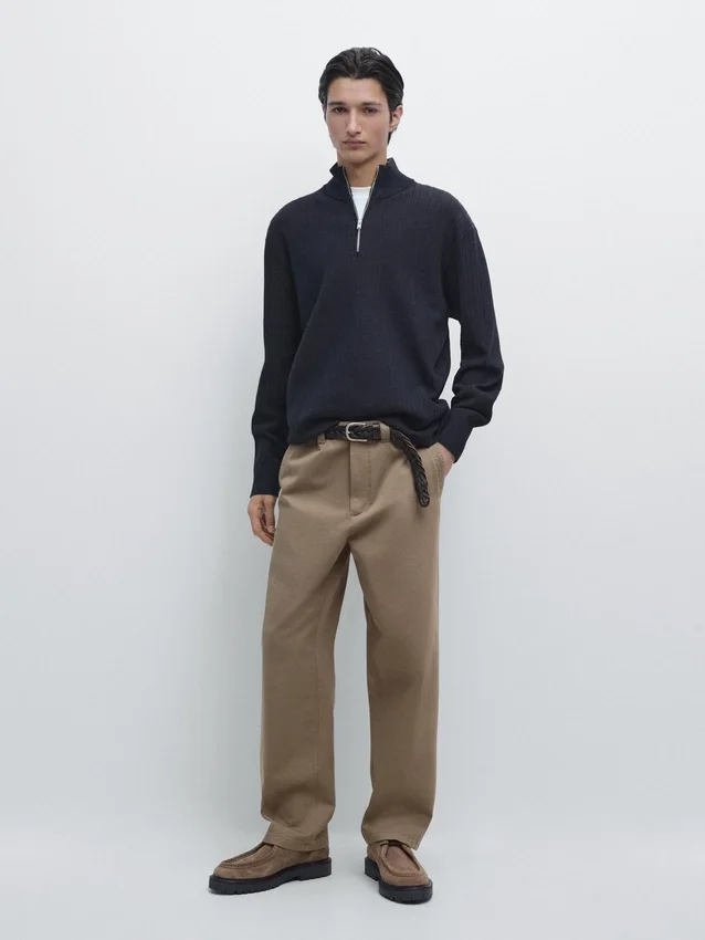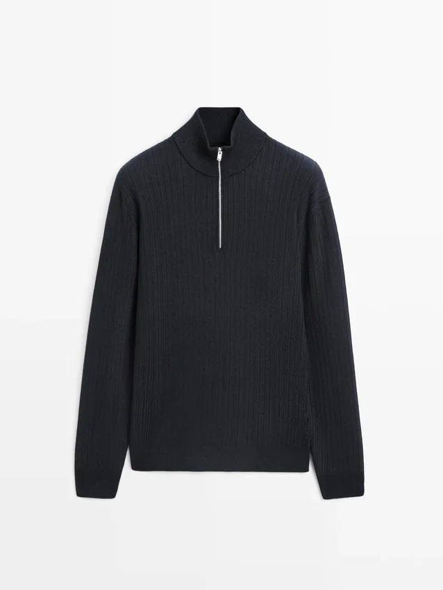 Knit Jumper Made of Cotton Fabric. Long Sleeves. Mock Neck with Zip.