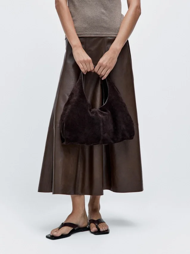 Handbag Made of Cowhide with a Split Leather Finish. A Handle/Shoulder Strap. Magnetic Snap-Button Fastening. An Inside Pocket. Cotton Lining.