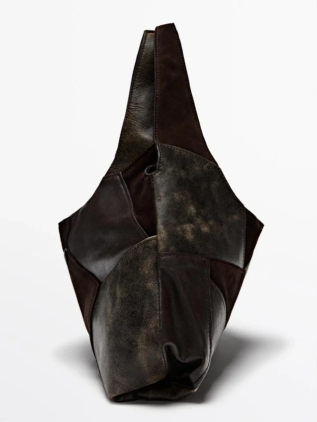 Leather Patchwork Bag, Combining Different Textures and Finishes in Cowhide Leather and Sheepskin. A Handle/Shoulder Strap. Magnetic Snap-Button Fastening. An Inside Pocket. Cotton Lining.