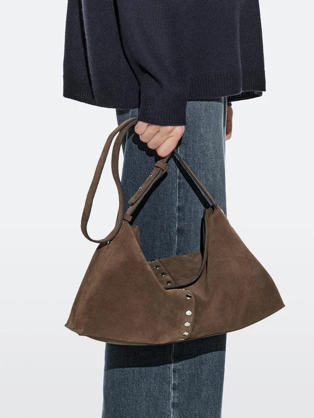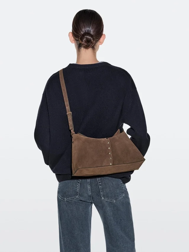 Handbag Made of Cowhide with a Split Leather Finish. Adjustable Crossbody Strap. Magnetic Snap-Button Fastening. An Inside Pocket. Cotton Lining. Metal Stud Detail.