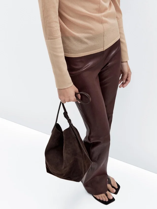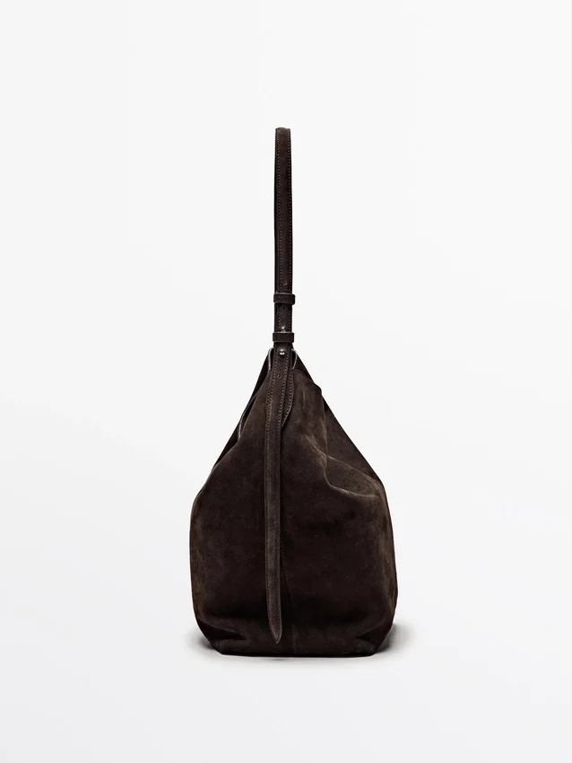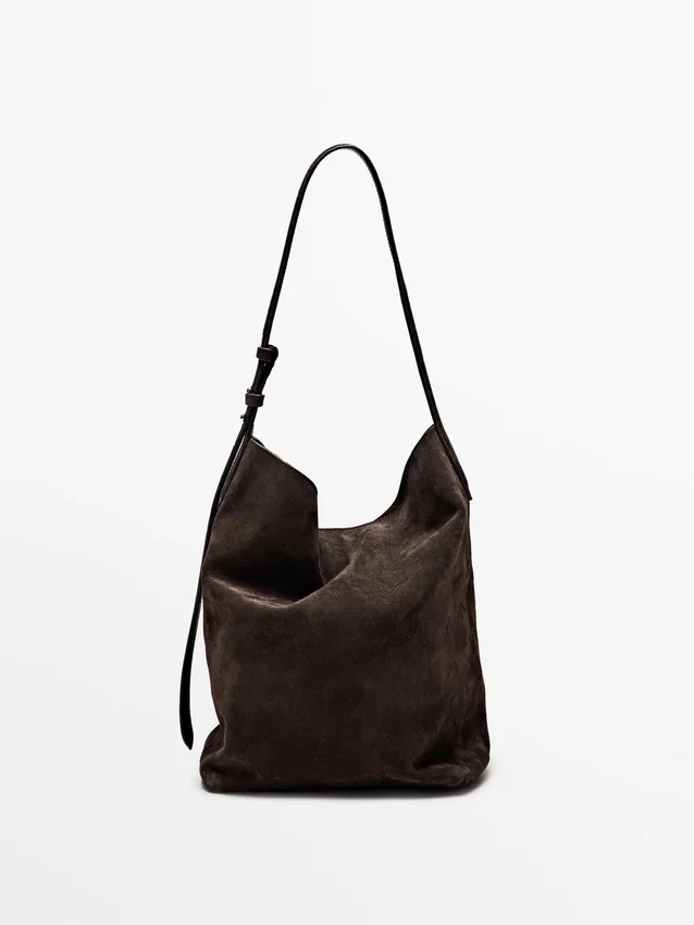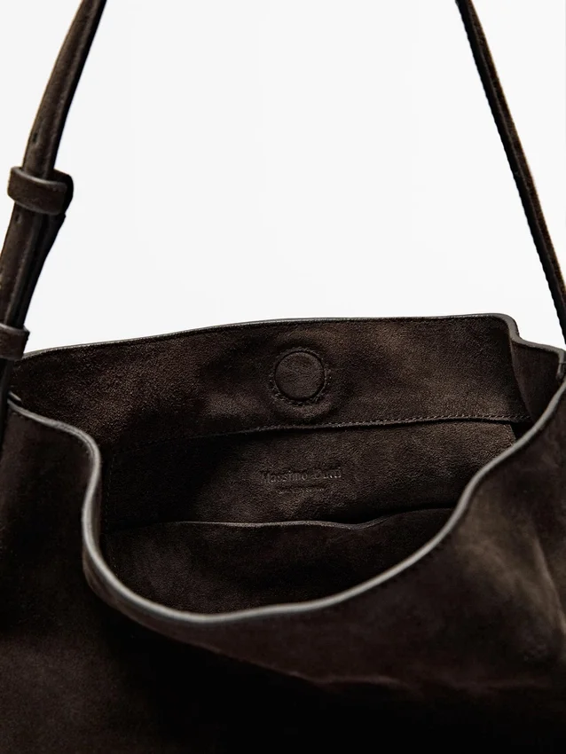Bucket Bag. Handbag Made of Cowhide with a Split Leather Finish. Adjustable Crossbody Strap. Flap with Concealed Magnetic Clasp Fastening. An Inside Pocket. Main Compartment.