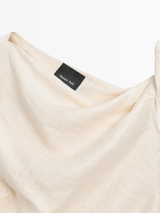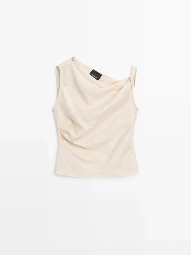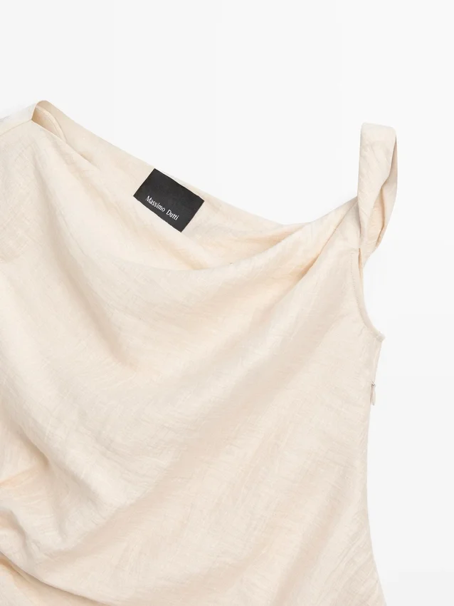 Asymmetric Top with Draped Details. Sleeveless. Knot Detail . Matching Garment Available.