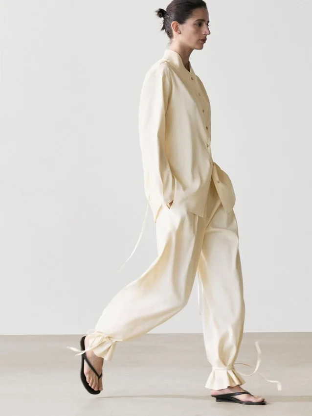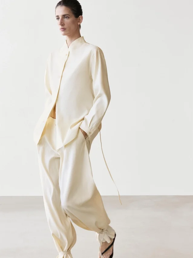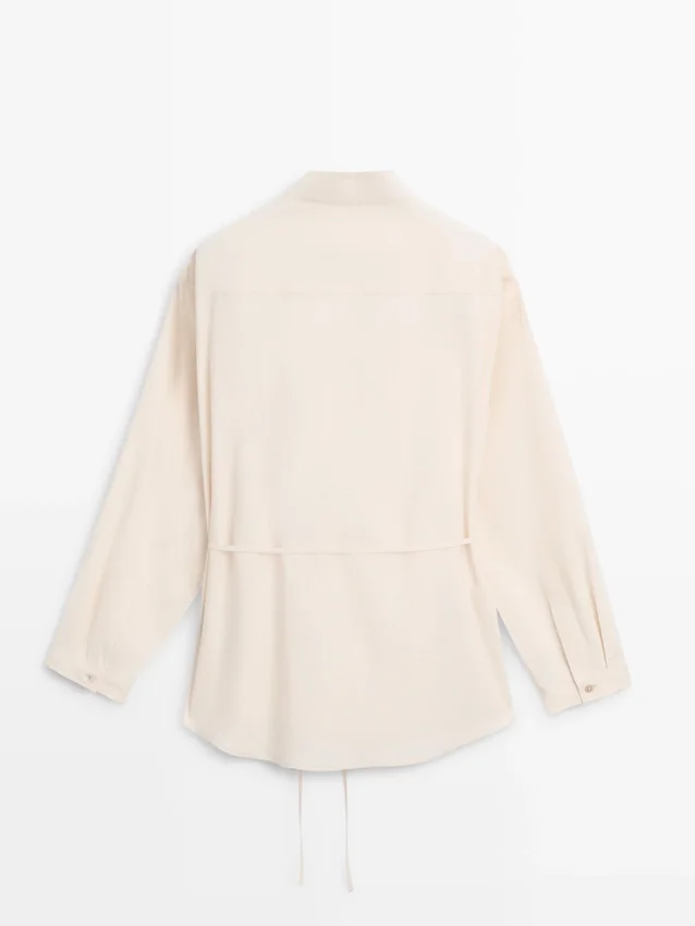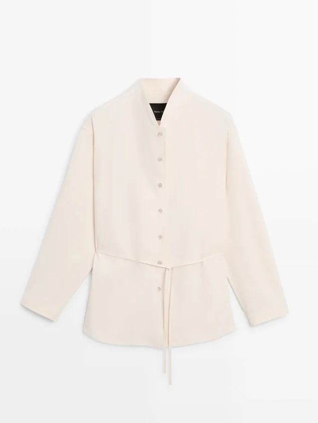 Overshirt Made of Linen Fabric. Long Sleeves. Overlaid Piece with Tie-Up Detail to Style It in Different Ways. Button-Up Front. High Collar. Matching Garment Available.