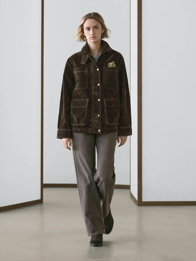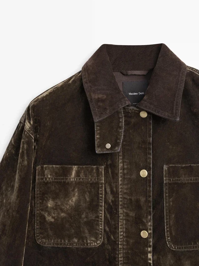 Denim Jacket. Long Sleeves with Buttoned Cuffs. Concealed Zip with Snap-Button Placket. Four Patch Pockets. Flock Finish, Velvety Effect, Soft to the Touch. Collar Detail.