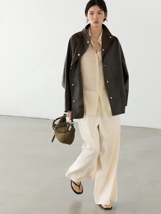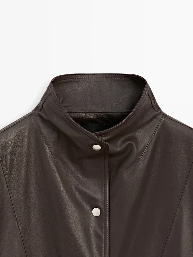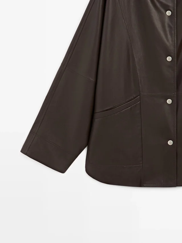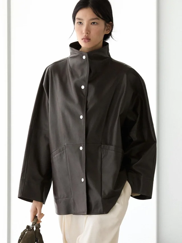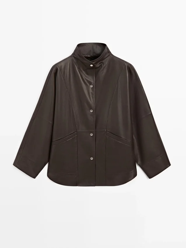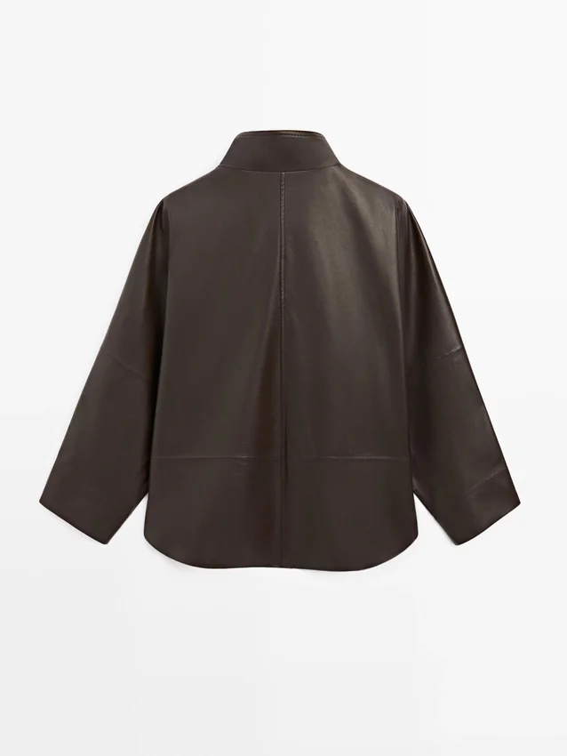Cape Made from Sheepskin with a Nappa Finish. Wide Long Sleeve. Button-Up Front. High Collar. Two Side Pockets. Seam Details .