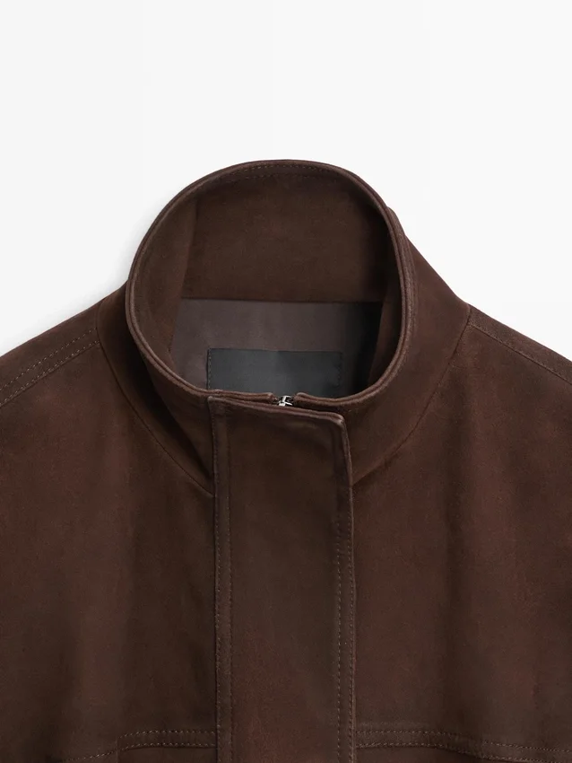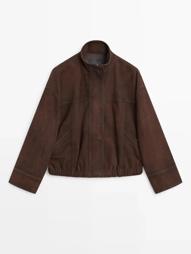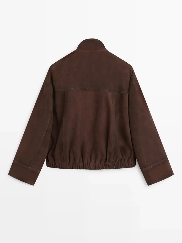 Bomber Jacket. Zip Fastening Concealed by a Placket with Snap Buttons. High Collar. Two Side Pockets. Elastic Band Detail at the Hem Area. Made of Goatskin Leather with Suede Finish.
