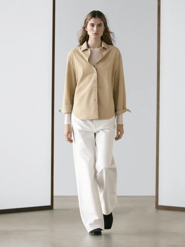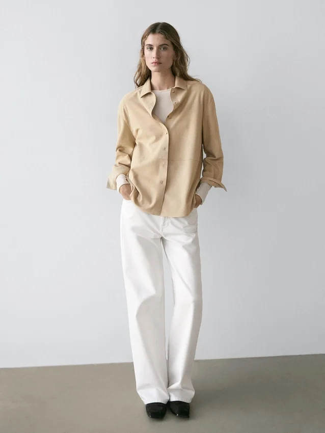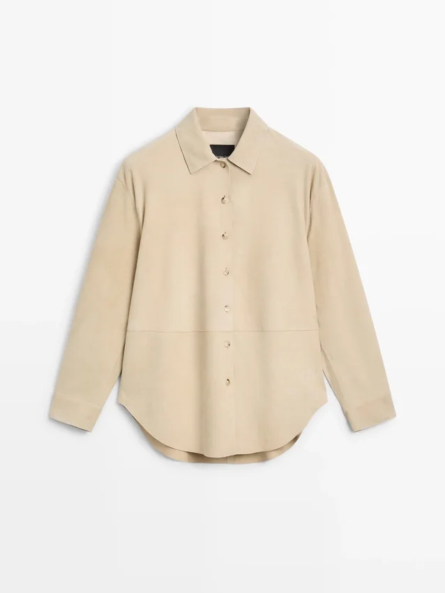 Shirt Made of Goatskin with a Suede Finish. Long Sleeves with Buttoned Cuffs. Shirt Collar. Lined. Seam Details .