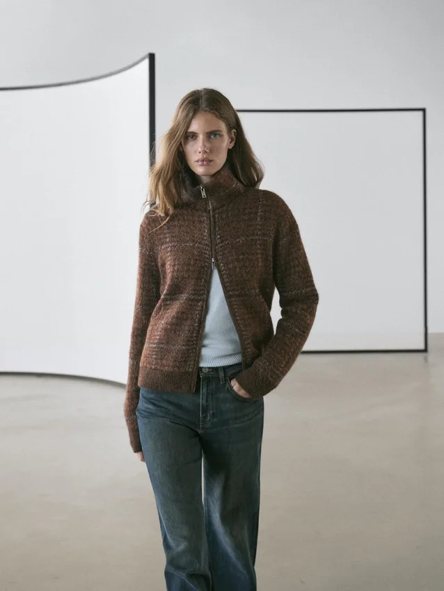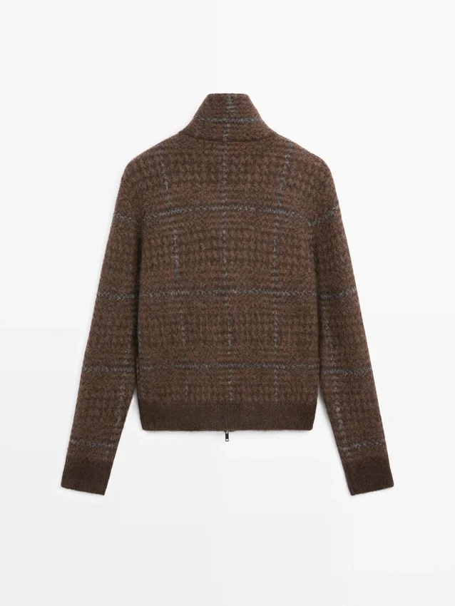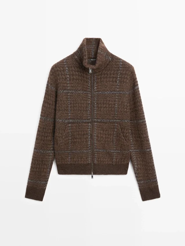 Jacket Made from Knitted Fabric with Alpaca and Wool. High Neck. Long Sleeves. It Has a Two-Way Zip Fastening. Two Front Pockets . Check Print. Brushed Finish.