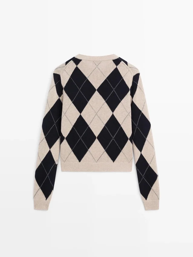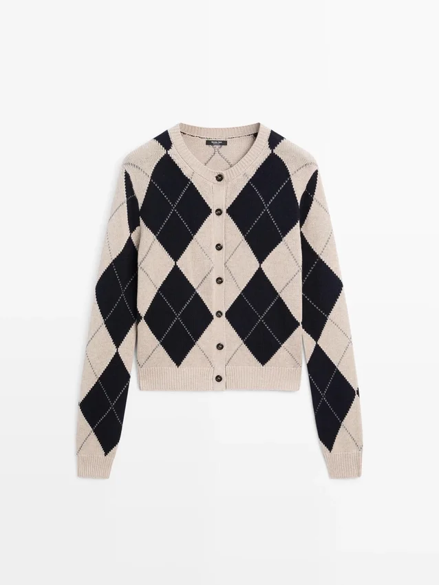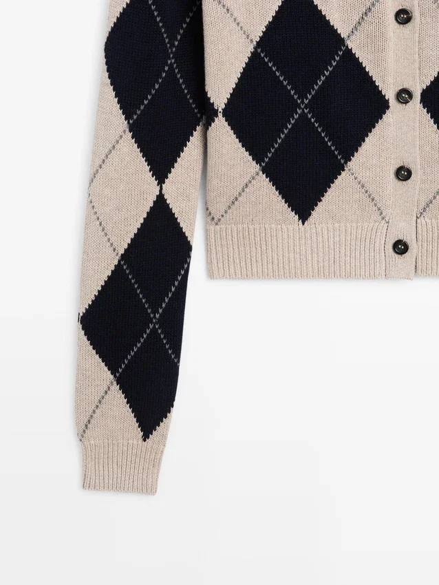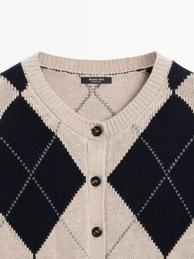 Cotton Blend Knit Cardigan. Crew Neck. Long Sleeves. Button-Up Front. Diamond Pattern Detail. Ribbed Trims .