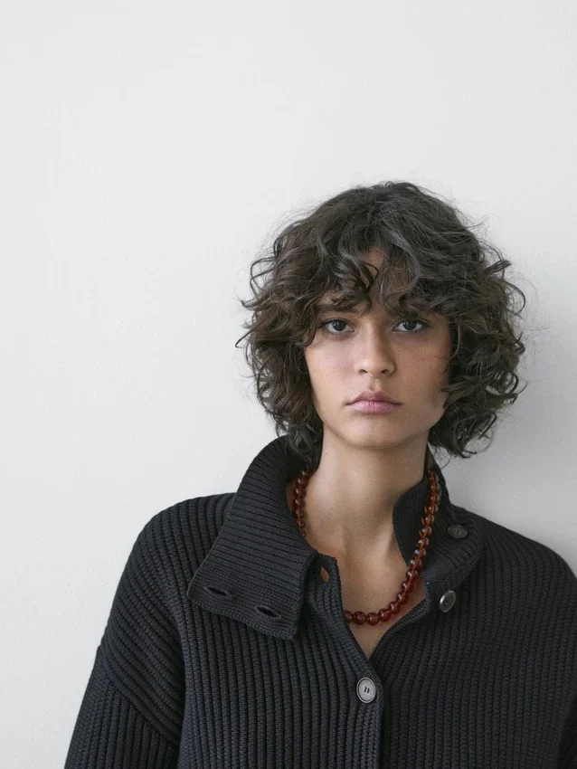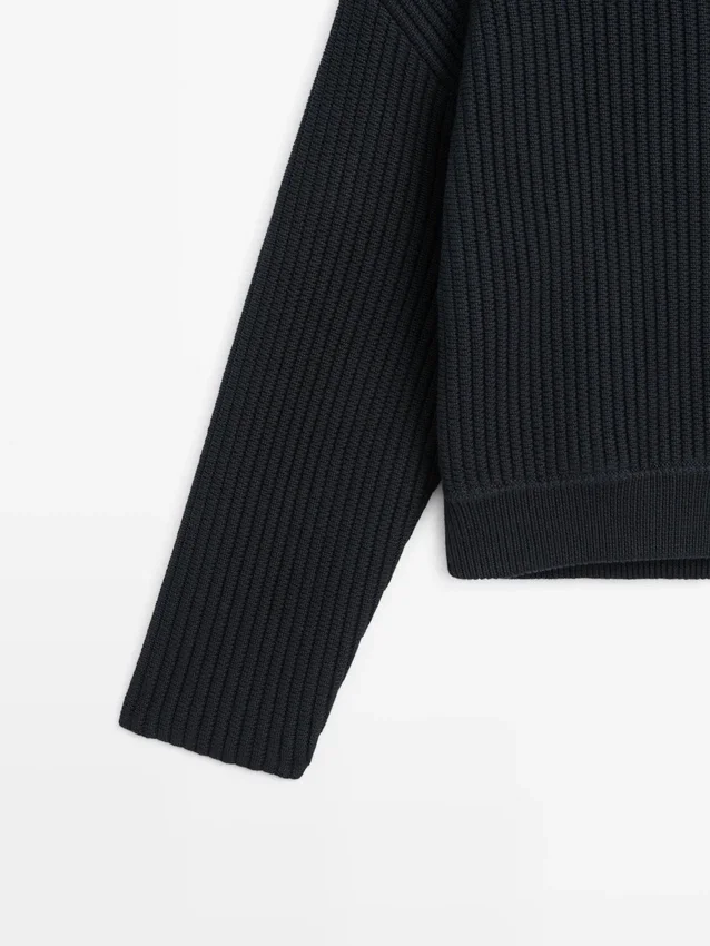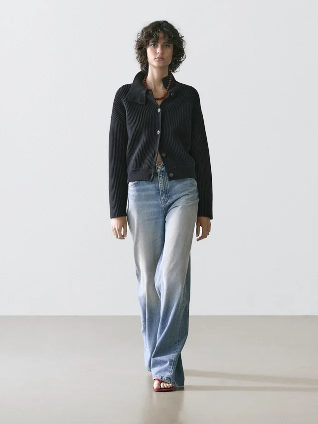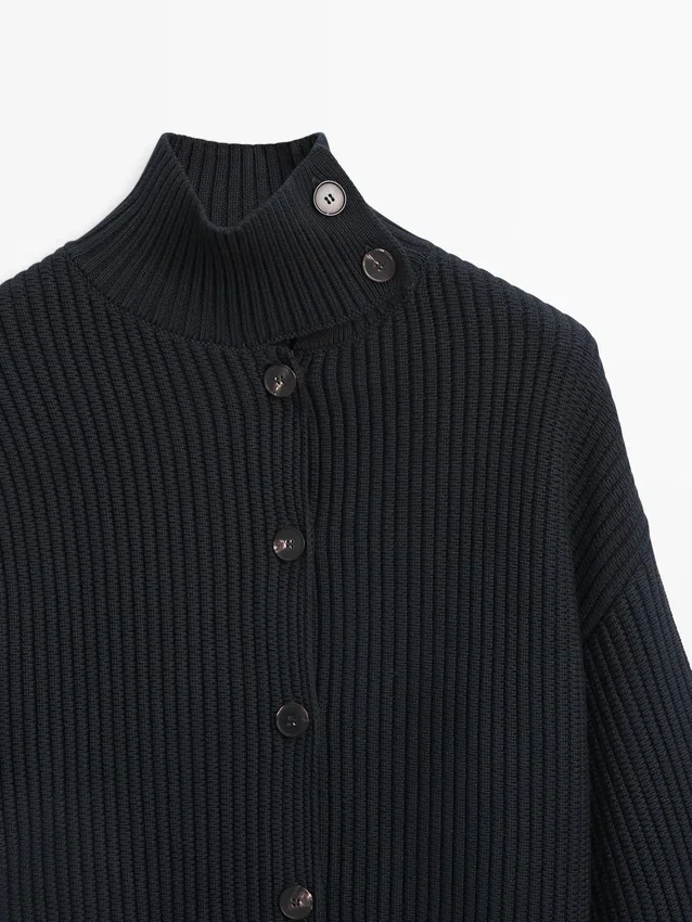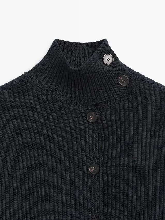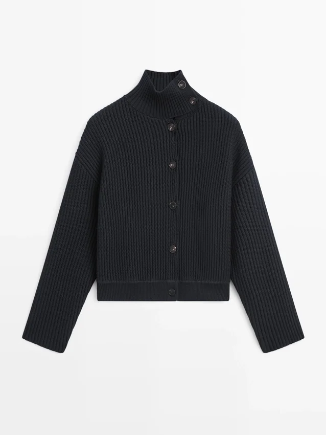 Cardigan Made of Knitted Fabric with Cotton. Buttoned High Collar. Long Sleeves. Button-Up Front. Ribbed Trims .