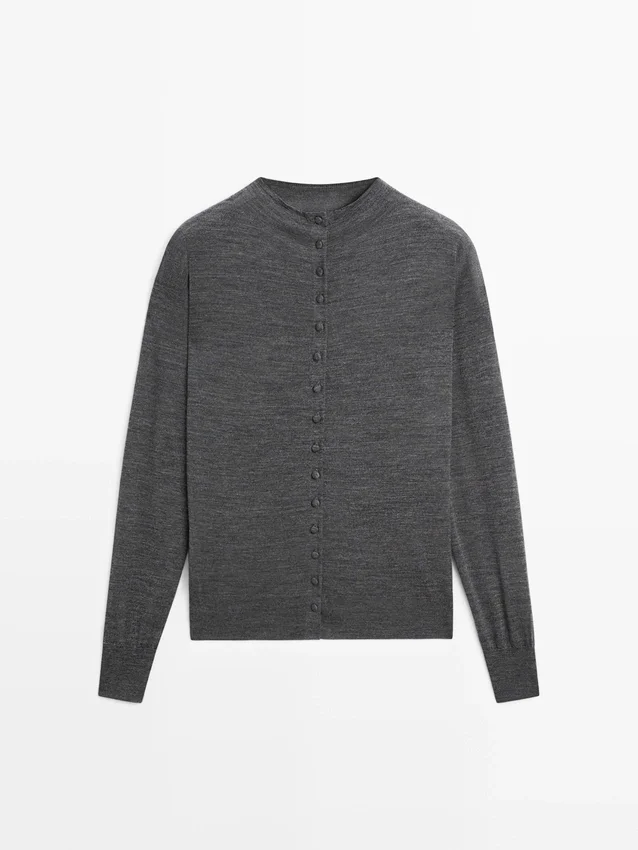 Wool Knit Cardigan. Mock Turtleneck. Long Sleeves. Button-Up Front. Ribbed Trims .