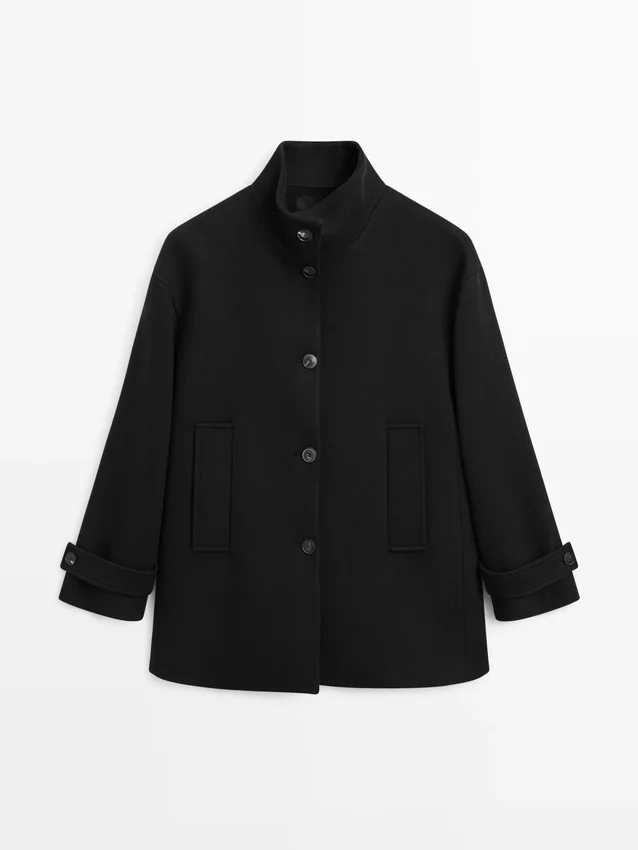 Wool Blend High Neck Coat with Button Fastening