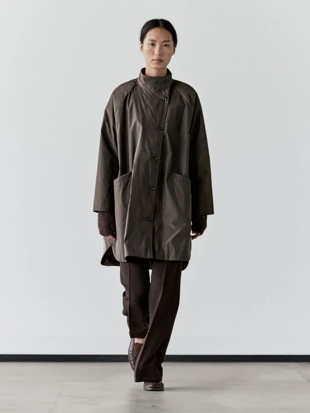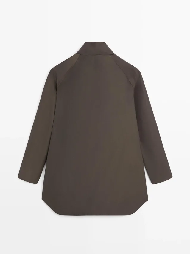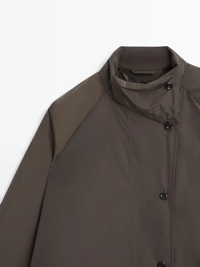 Long Puffer Jacket . Buttoned High Collar. Long Sleeves. Button-Up Front. Two Side Pockets.