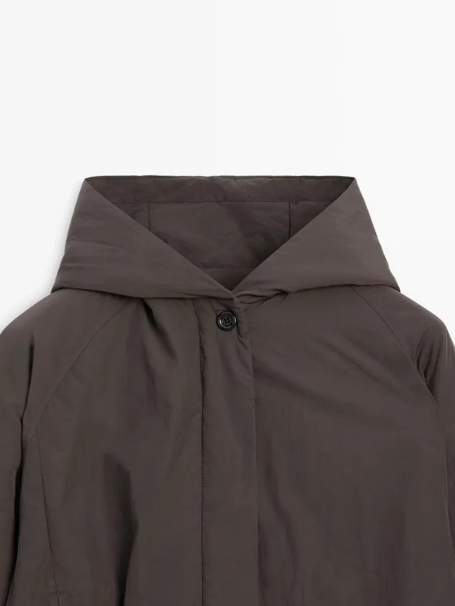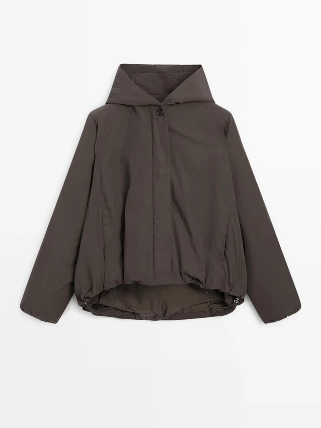 Bomber Jacket. Raglan Sleeve. Concealed Zip Closure with Buttoned Placket. Hooded. Adjustable Elasticated Hem. Two Side Pockets. Water-Repellent Fabric.