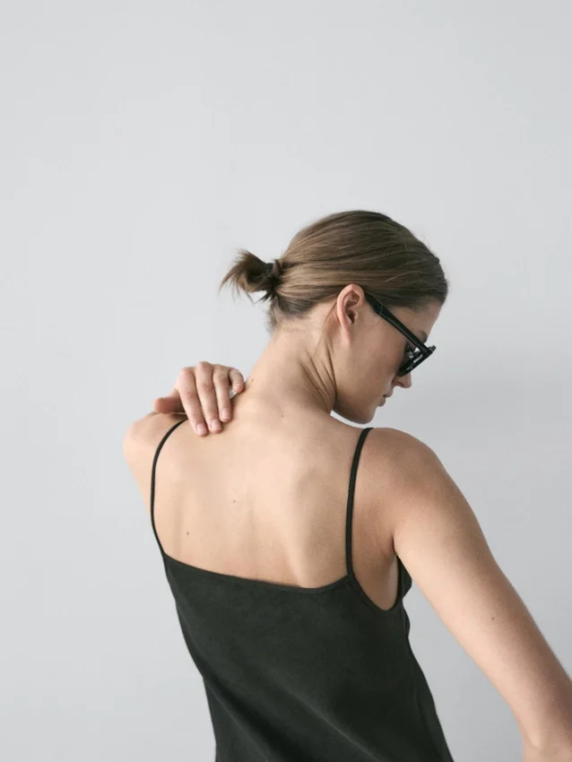 Dress Made of 100% Linen Fabric. Straight-Cut Neckline. Strappy. Side Split Hem.