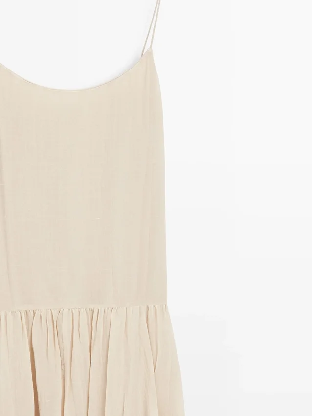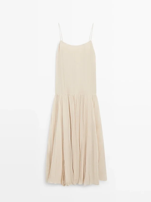 Dress Made of Flowing Fabric. Round Front and Back Neckline. Strappy. Pleated Detail.
