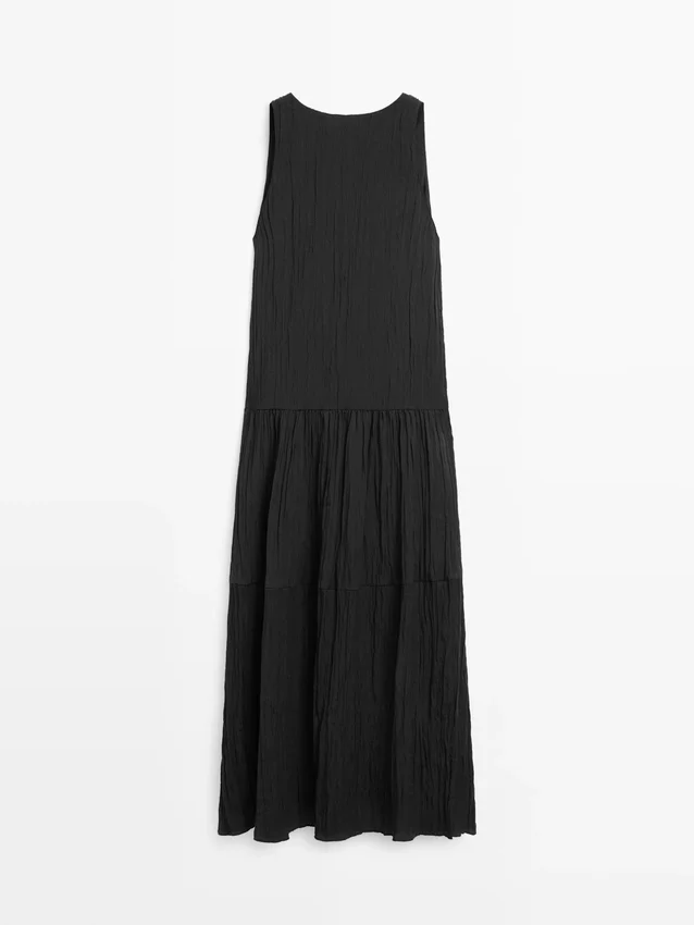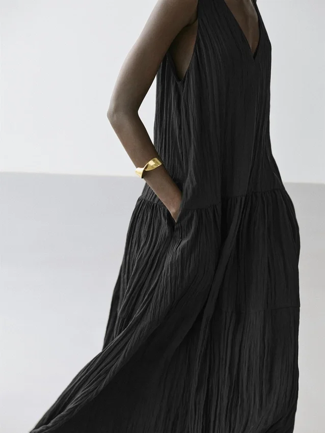 Midi Dress with Pleated Finish. Thick Straps. V-Neck. Cotton Lining. Flowing and Lightweight Fabric .