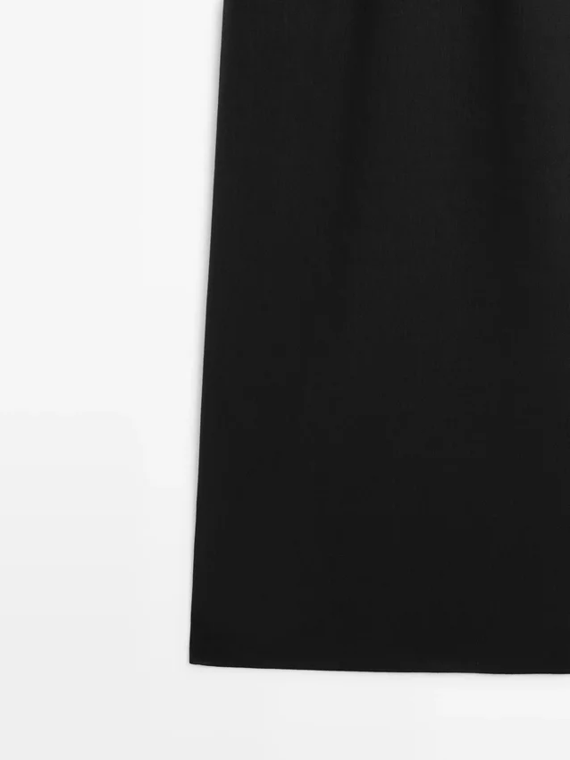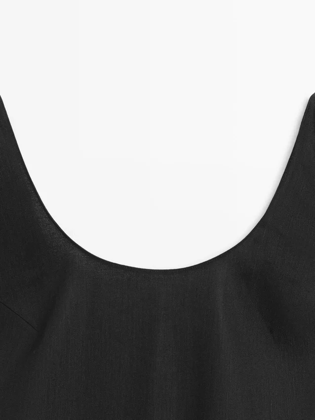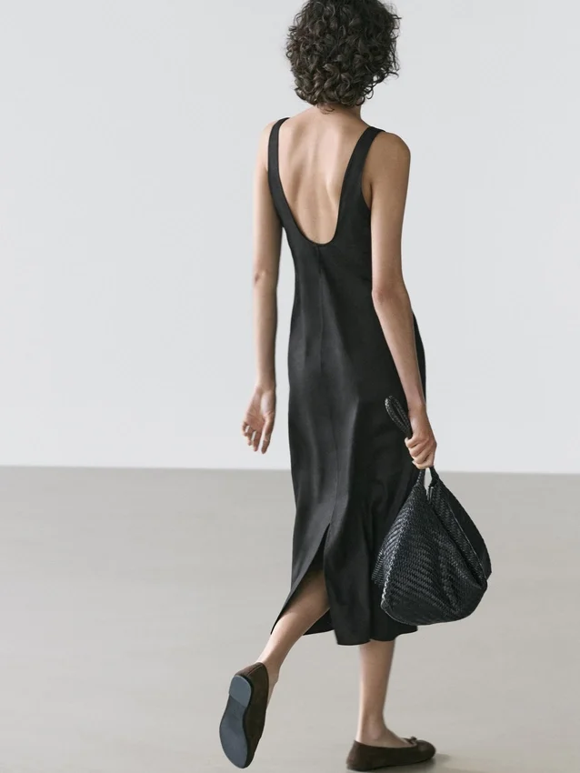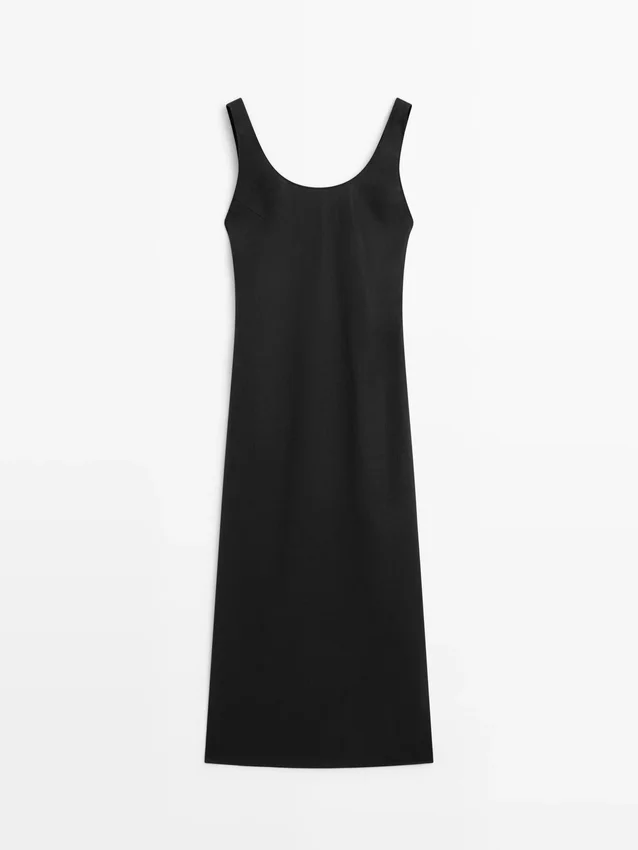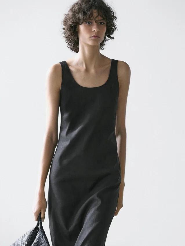 Midi Dress Made of a Linen Blend. Neckline Detail at the Back . Round Neck. Thick Straps. Flowing and Lightweight Fabric .