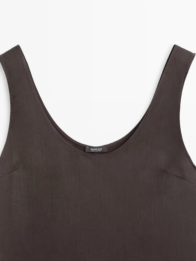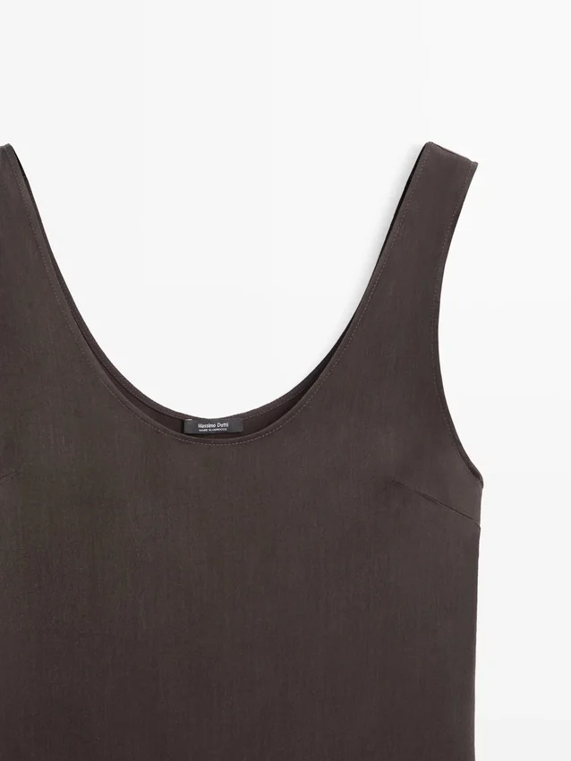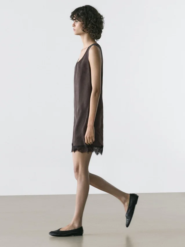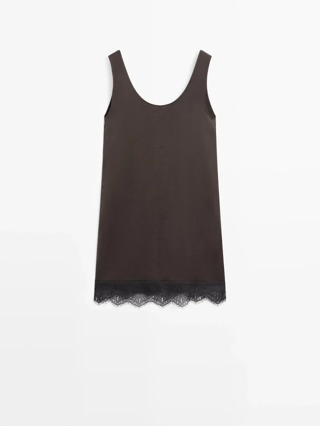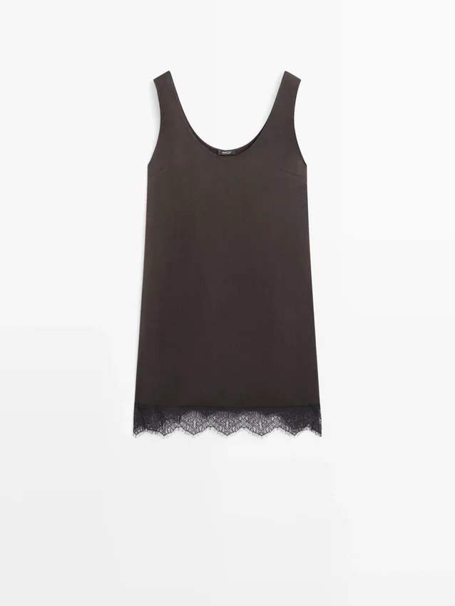 Dress Made of Flowing Fabric. Round Front and Back Neckline. Thick Straps. Lace-Finished Hem .