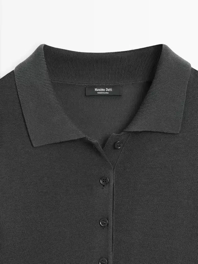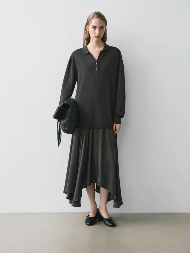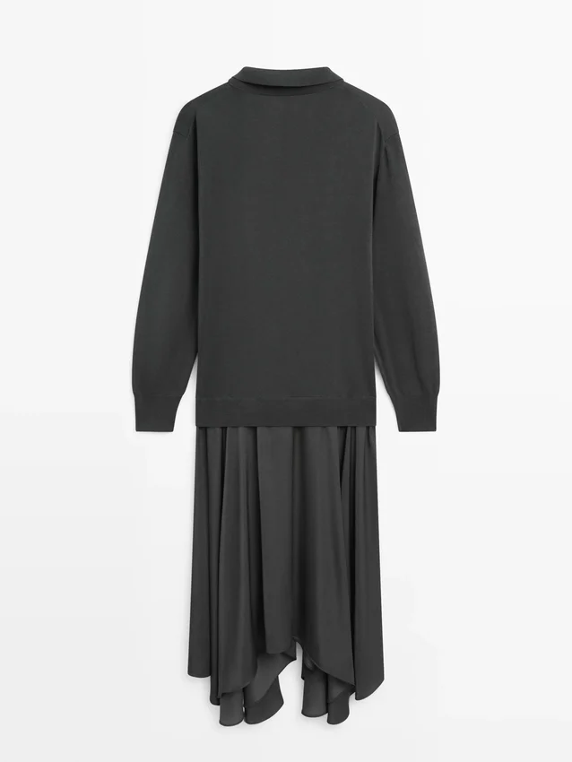 Midi Dress with Flared Skirt and Knitted Top.. Long Sleeves. Polo Collar with Button Fastening.
