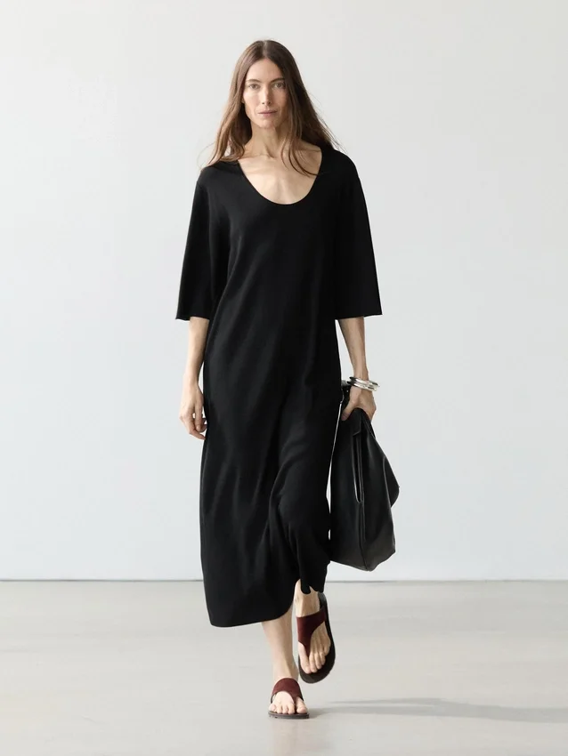 Midi Dress Made of Fabric with Cotton. Round Neck. Three-Quarter Length Sleeves.