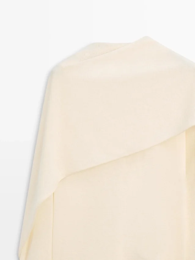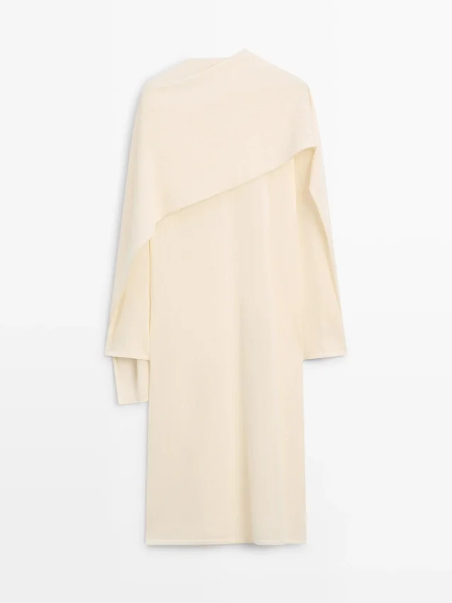 Long Tunic Dress. Crew Neck. Long Sleeves. Fine, Lightweight Fabric. Matching Garment Available. The Cape is Not Detachable, It is Knitted as Part of the Sweater.