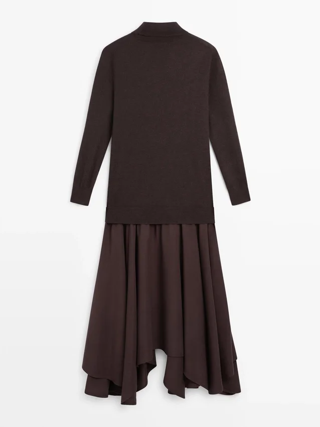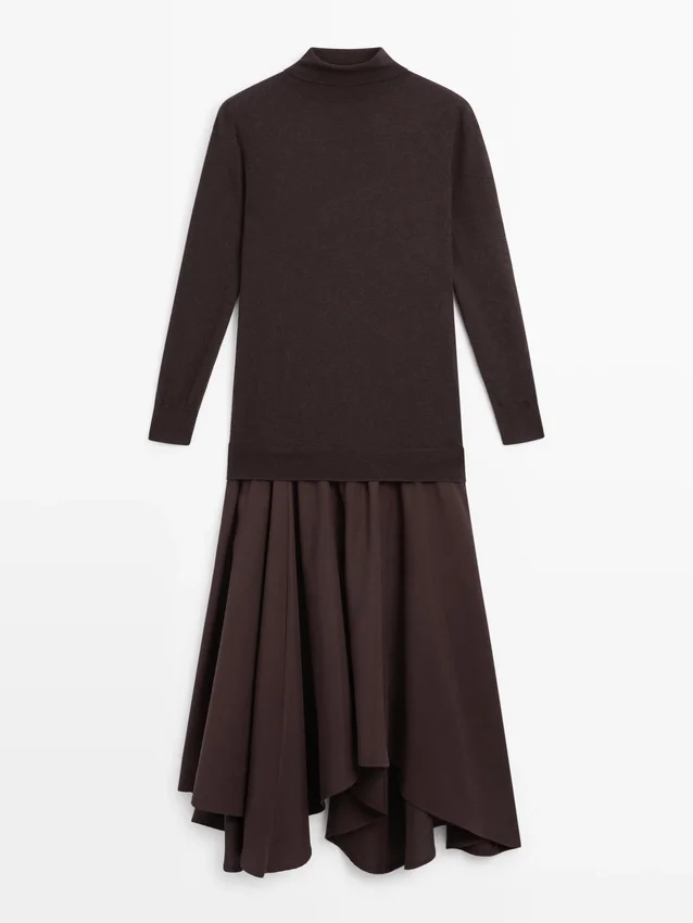 Midi Dress with Flared Skirt and Knitted Top.. Long Sleeves. High Collar.