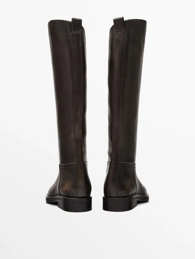 Made of Cowhide Leather. Brushed Distressed Leather. Detachable Ankle Strap. Gold Appliquas. Leather Lining and Insole . Leg Height: 42 Cm. Leg Width: 37 Cm. Heel: 3Cm. Includes Airfit® Insole: Flexible Technical Foam Insole, Designed to Offer Greater Comfort.