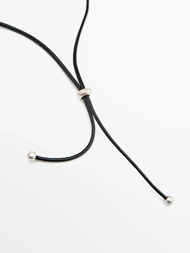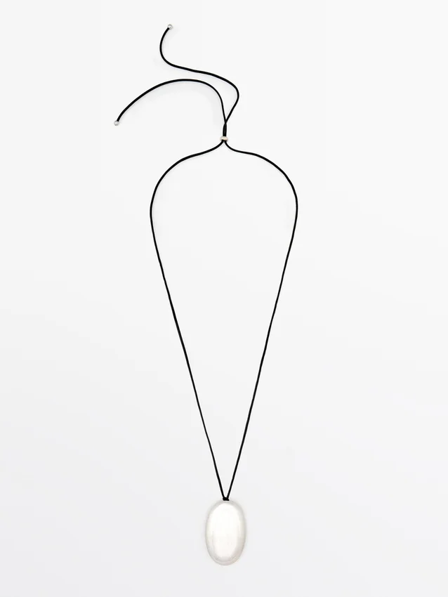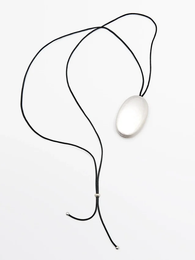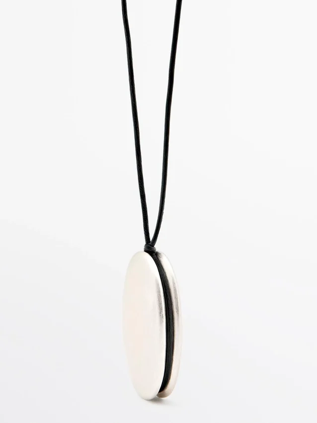 Metal Pendant Necklace. Leather Tie Detail. Drawstring Closure.