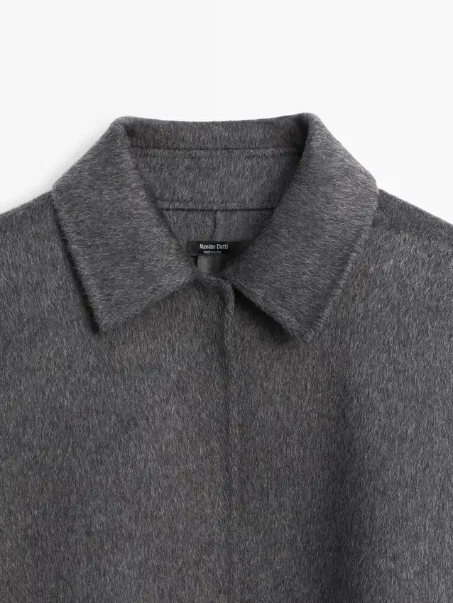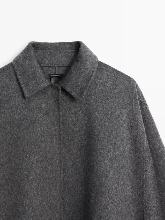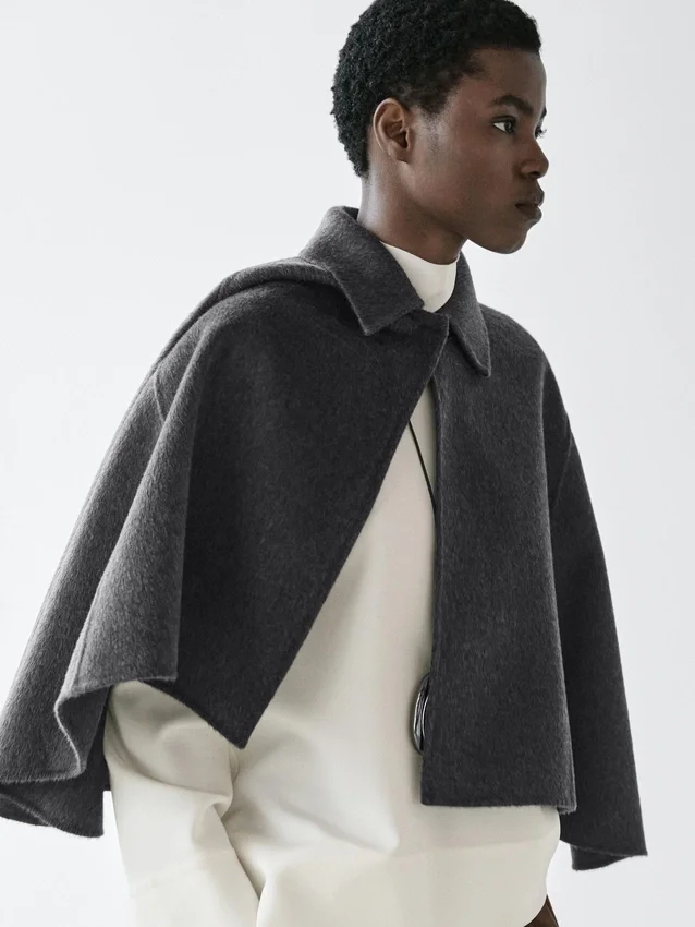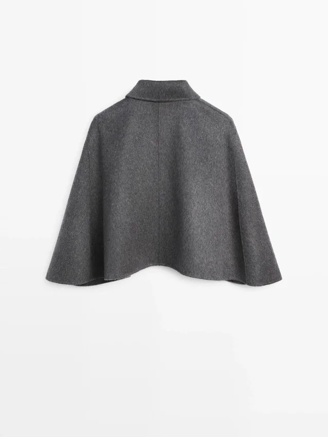 Wool Blend Cape. Shirt Collar. Button and Hidden Buttoned Strap Fastening .