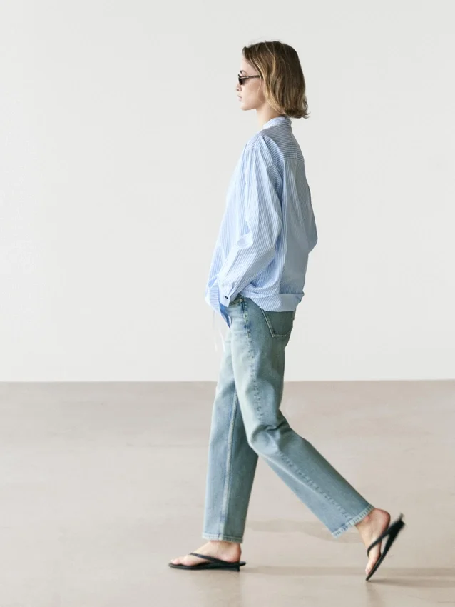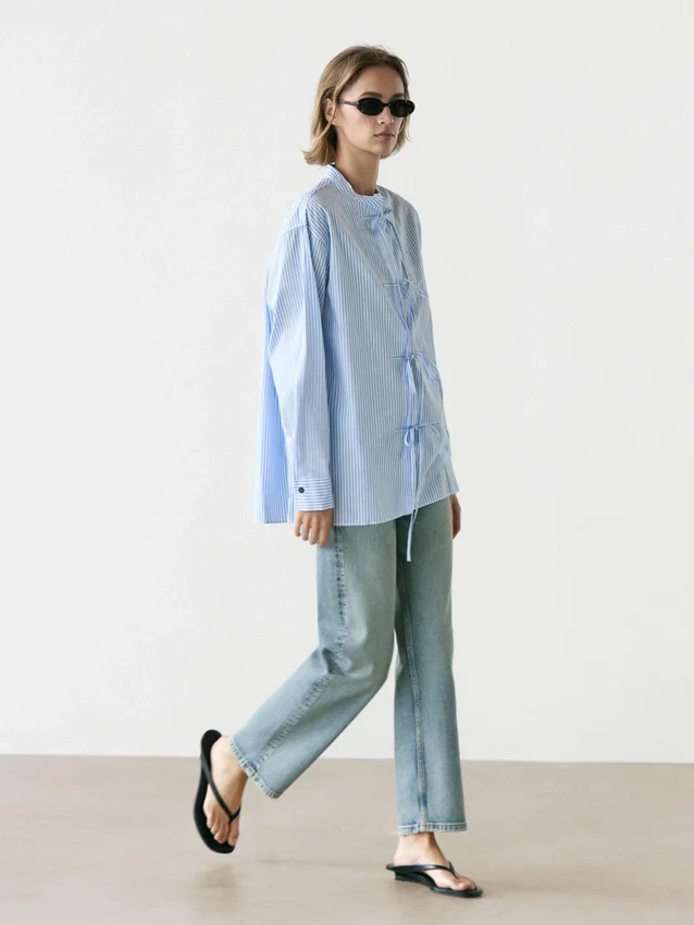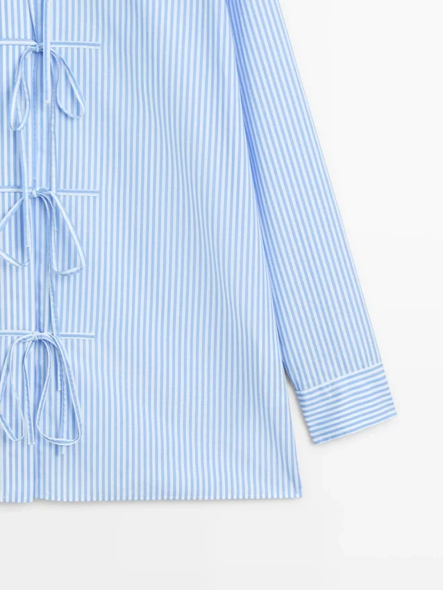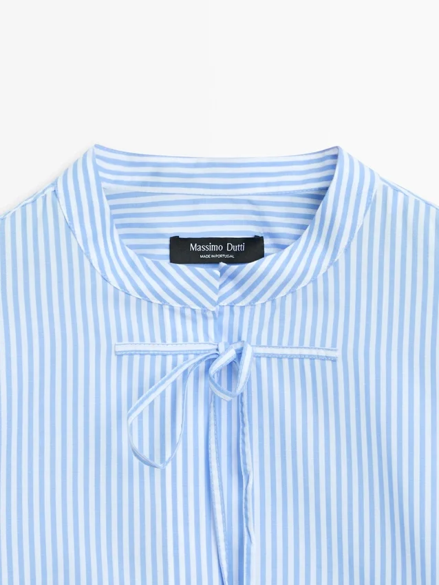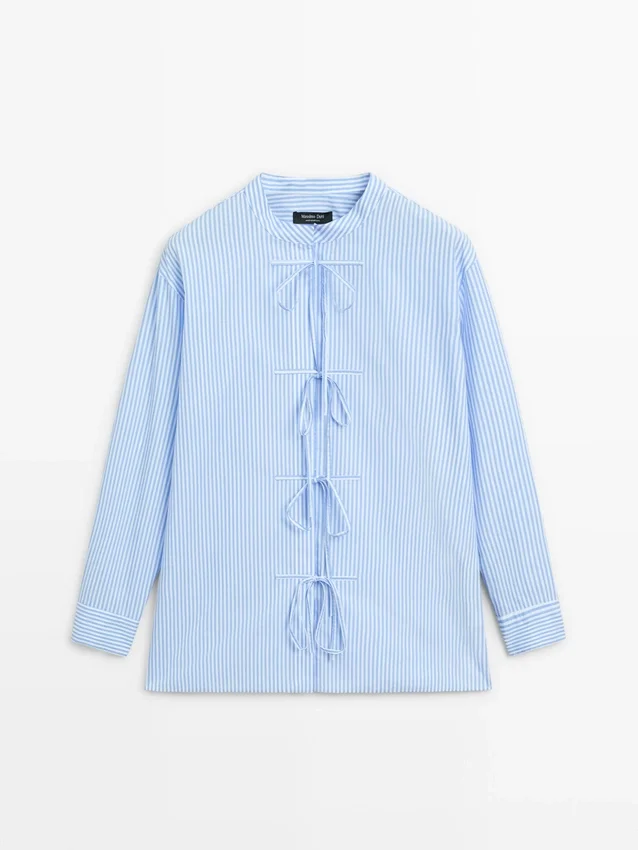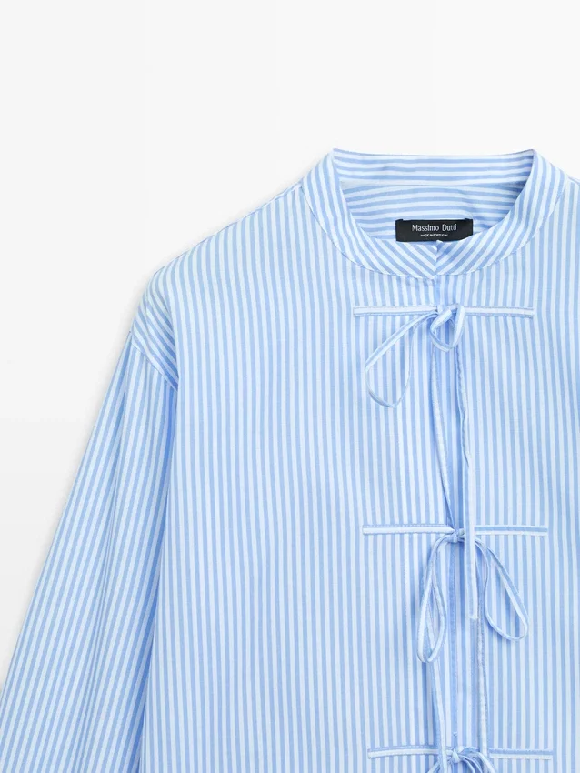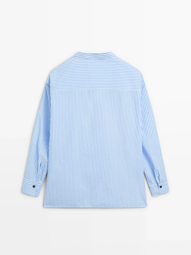 Shirt Made of 100% Cotton Fabric. Long Sleeves with Buttoned Cuffs. Stand-Up Collar. Drawstring Fastening. Striped Print.