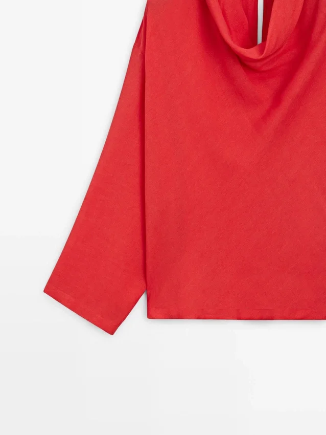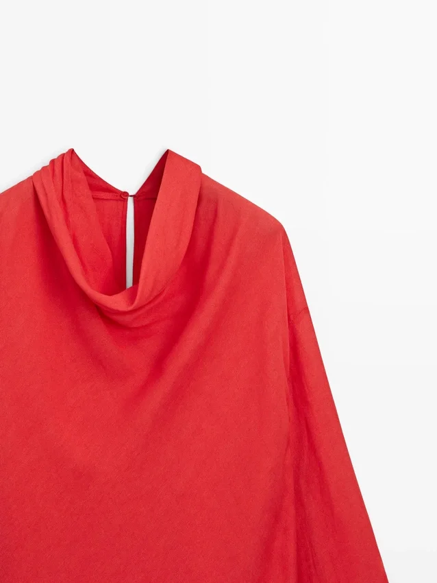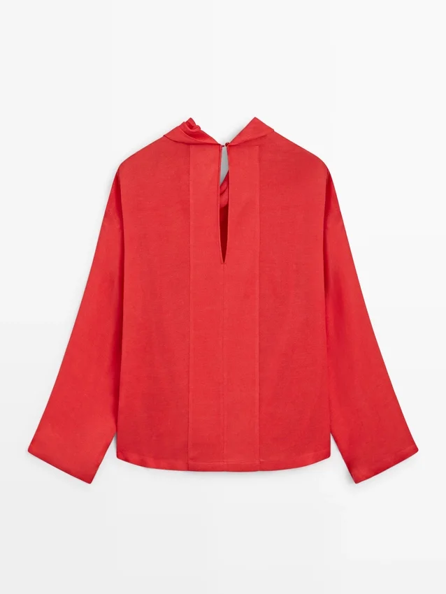 Flowing Blouse. Draped Collar. Long Sleeves. Back Button Fastening and Teardrop Opening.