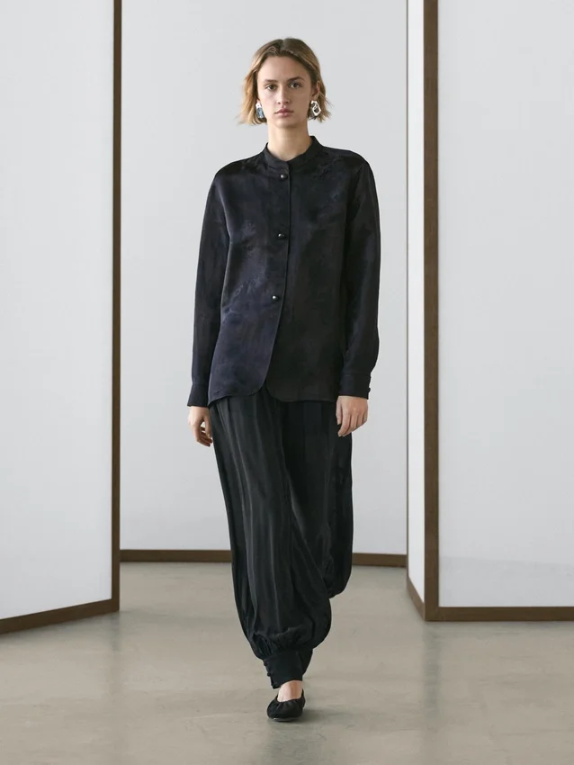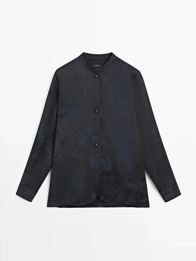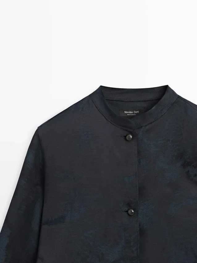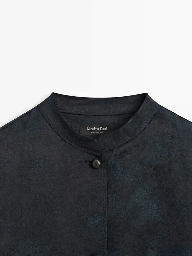 Flowing Shirt Made of a Linen Blend Fabric. Long Sleeves with Buttoned Cuffs. Stand-Up Collar. Jacquard Print. Button-Up Front.