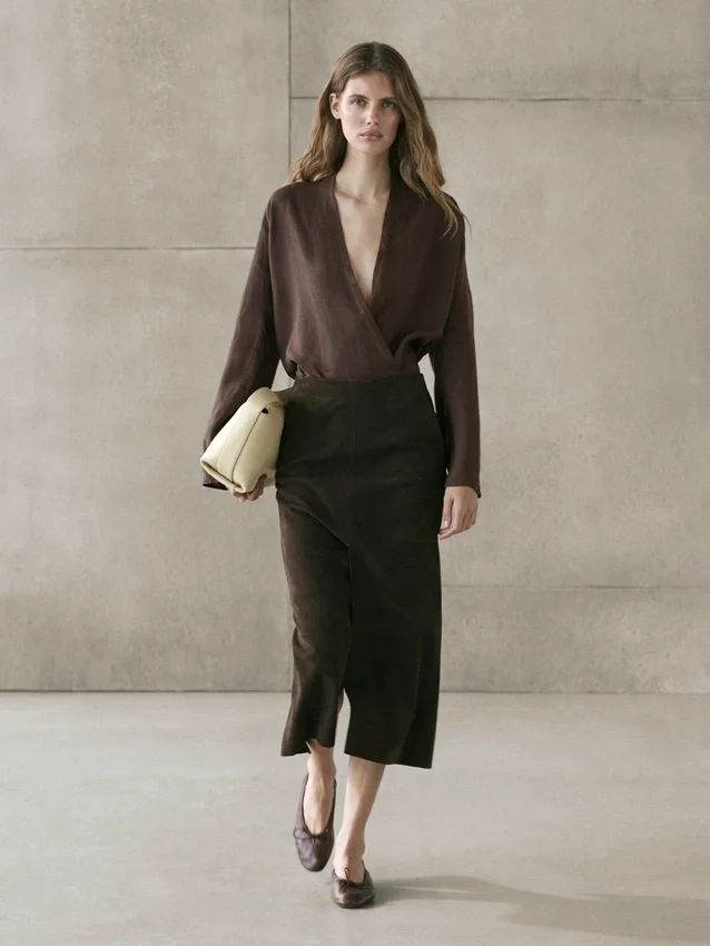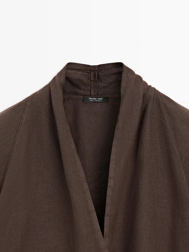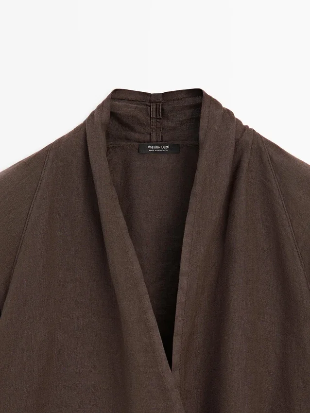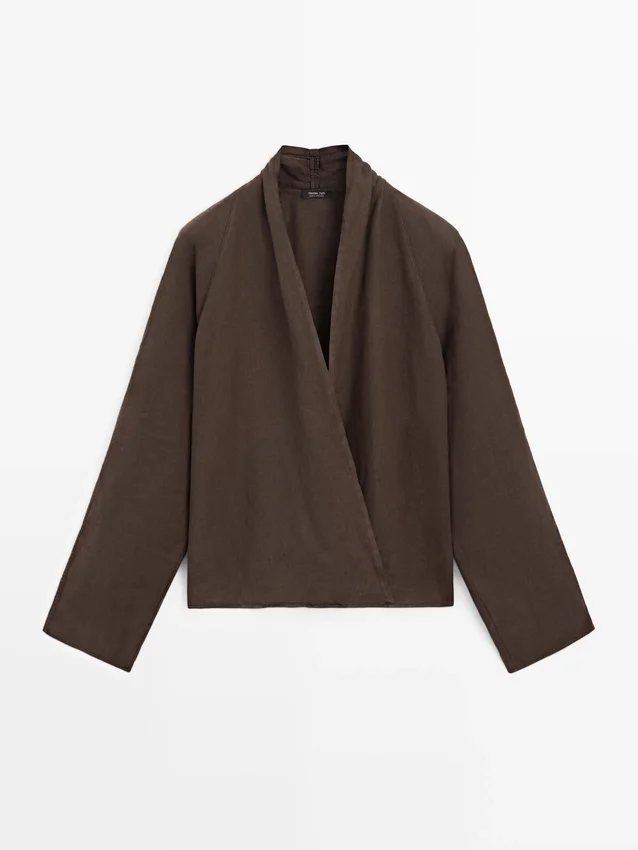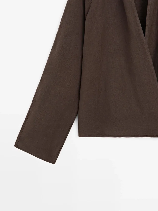 Blouse Made of 100% Linen Fabric. V-Neck . Long Sleeves. Cross-Over Fastening with Hidden Buttons. Draped Neckline Detail. Flowing and Lightweight Fabric . Wide and Relaxed Silhouette, Not Tailored.
