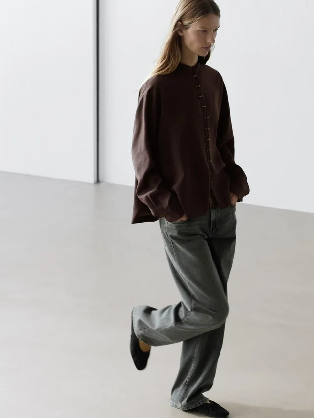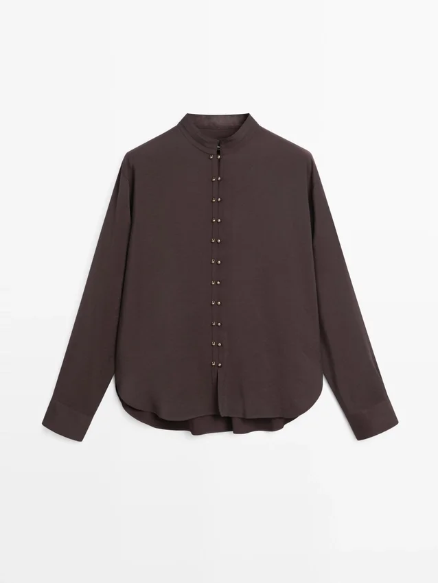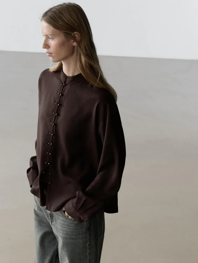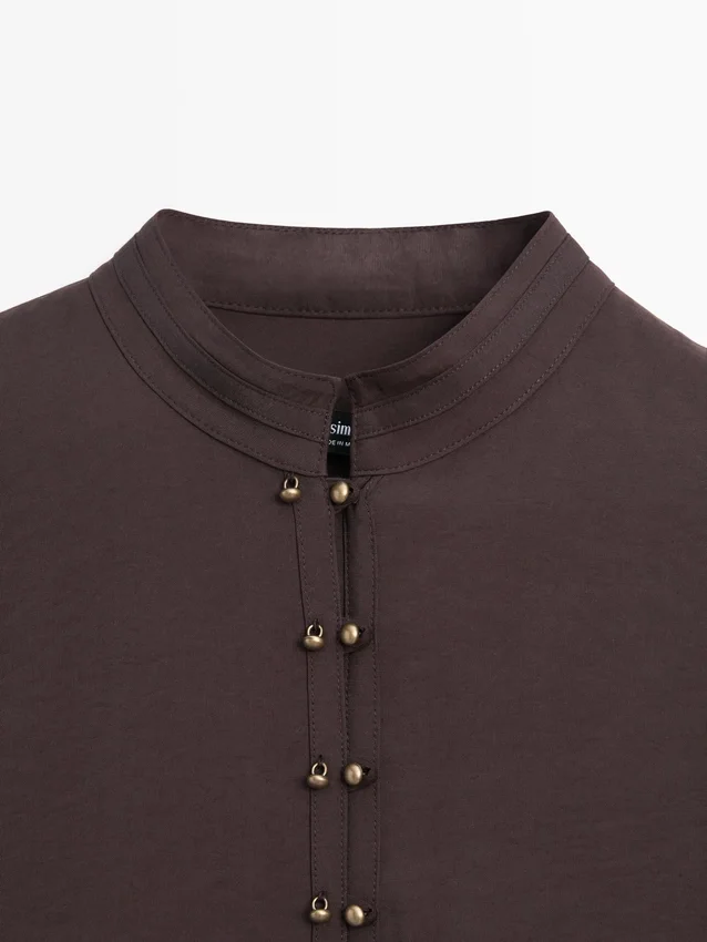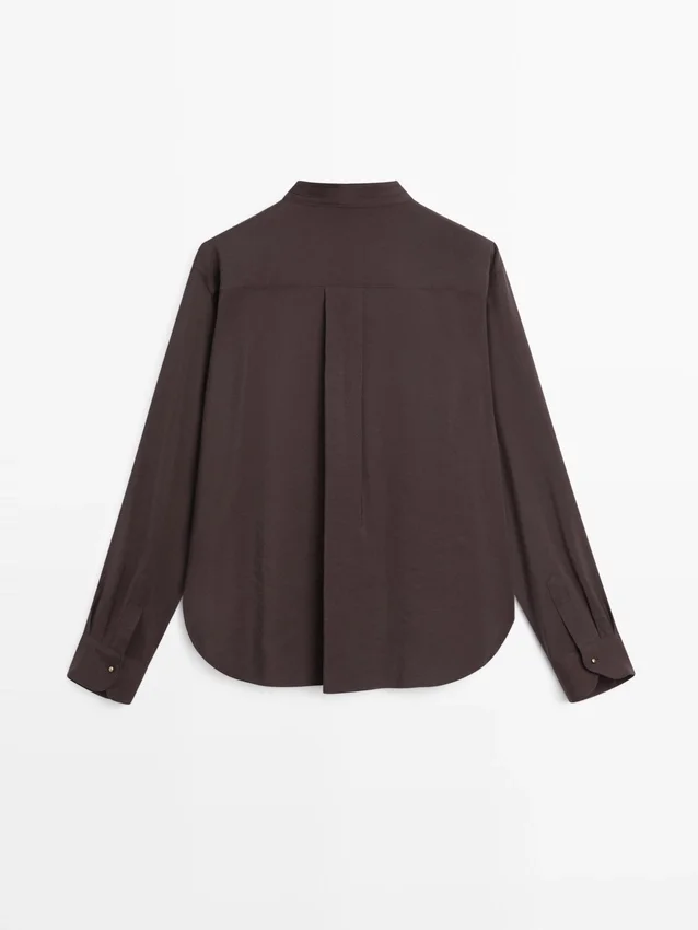Flowing Shirt. Long Sleeves with Buttoned Cuffs. Stand-Up Collar. Button-Up Front. Centre Pleat Detail at the Back.