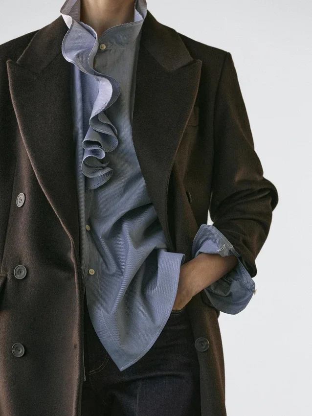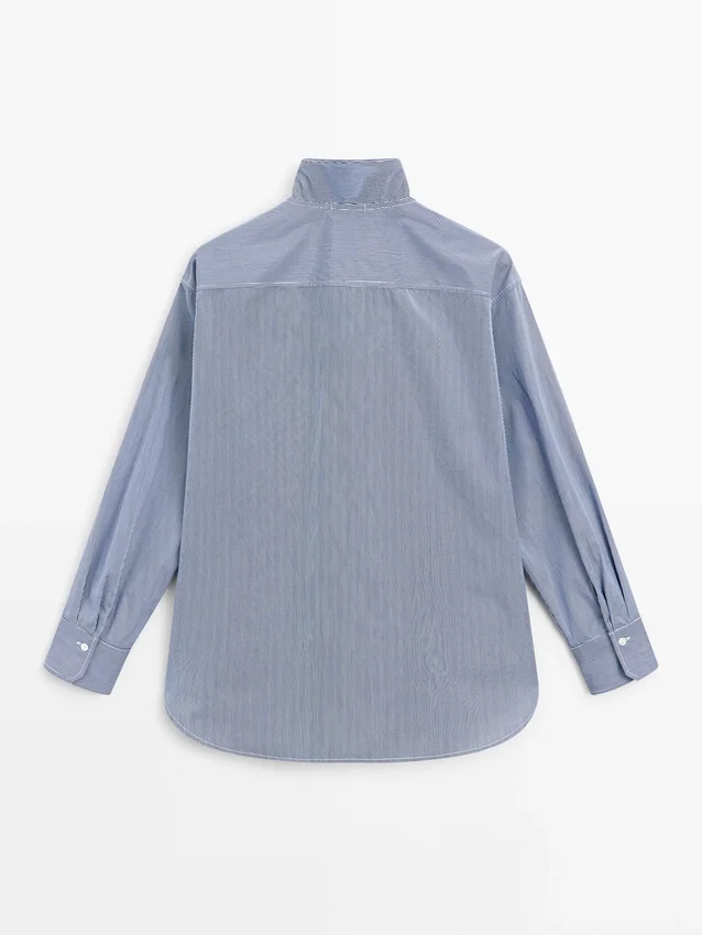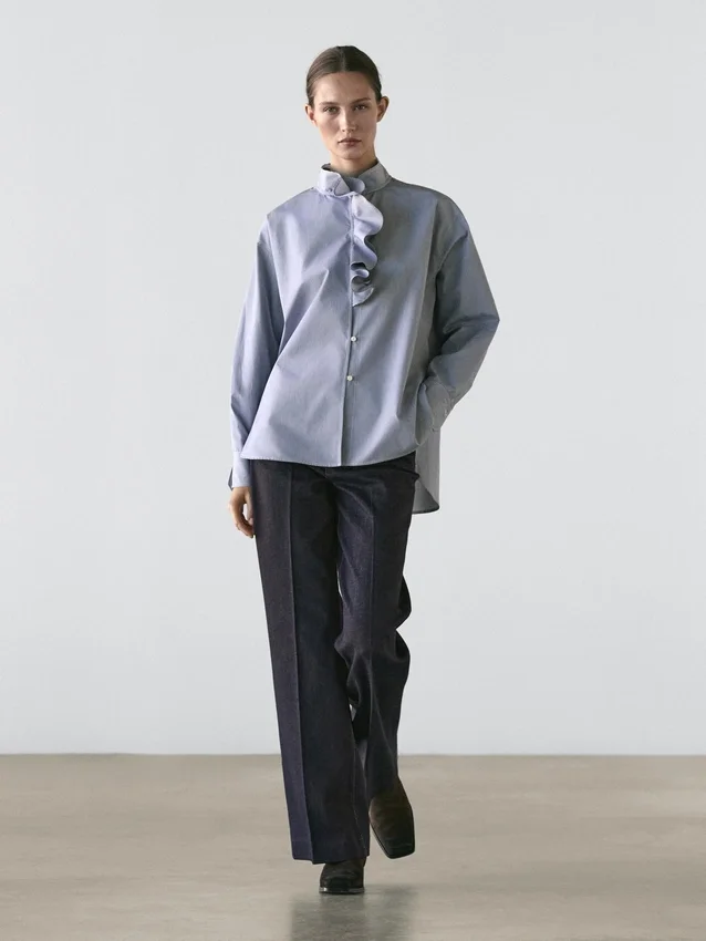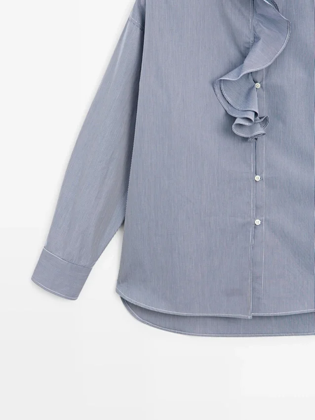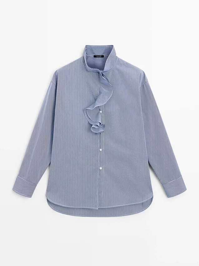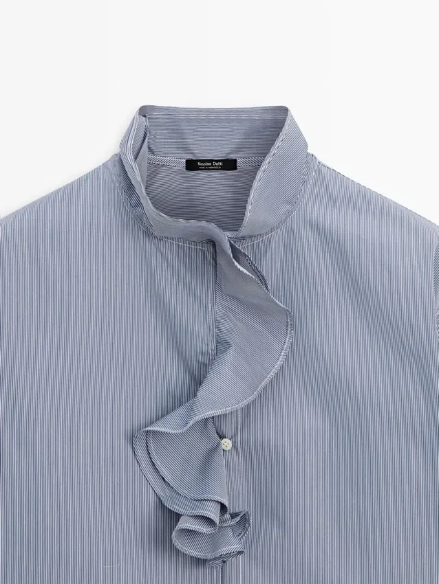 Shirt Made of 100% Cotton Fabric. Long Sleeves. Ruffled Detail on the Neck . Button-Up Front. Striped Detail.