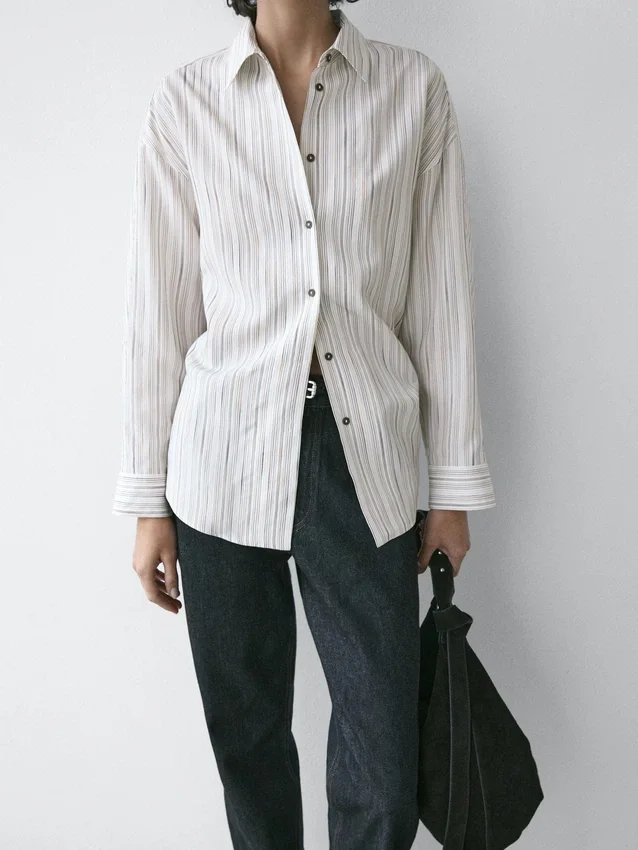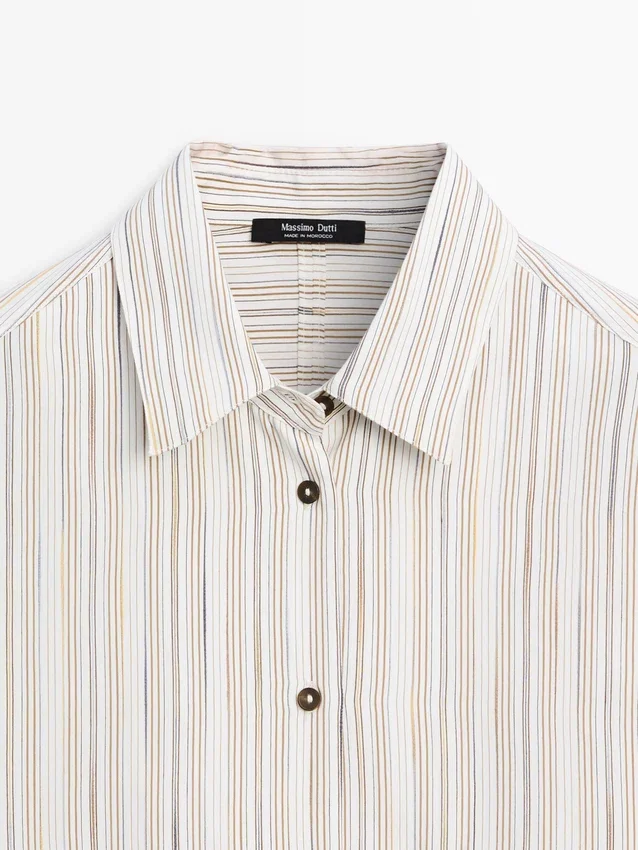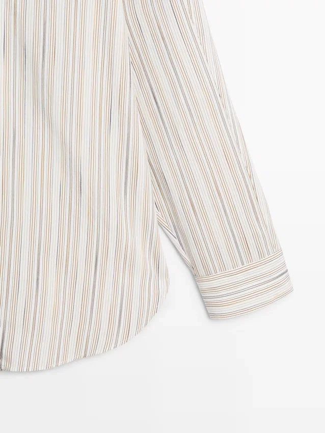 Flowing Shirt. Long Sleeves with Buttoned Cuffs. Shirt Collar. Button-Up Front. Striped Detail.