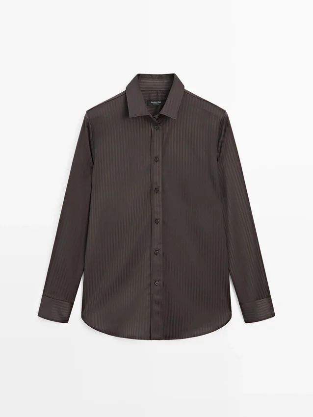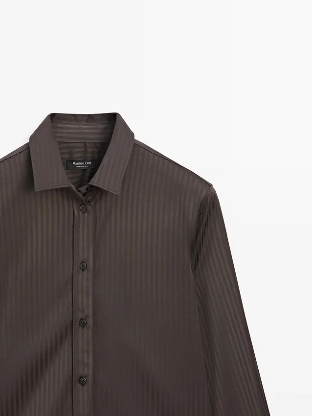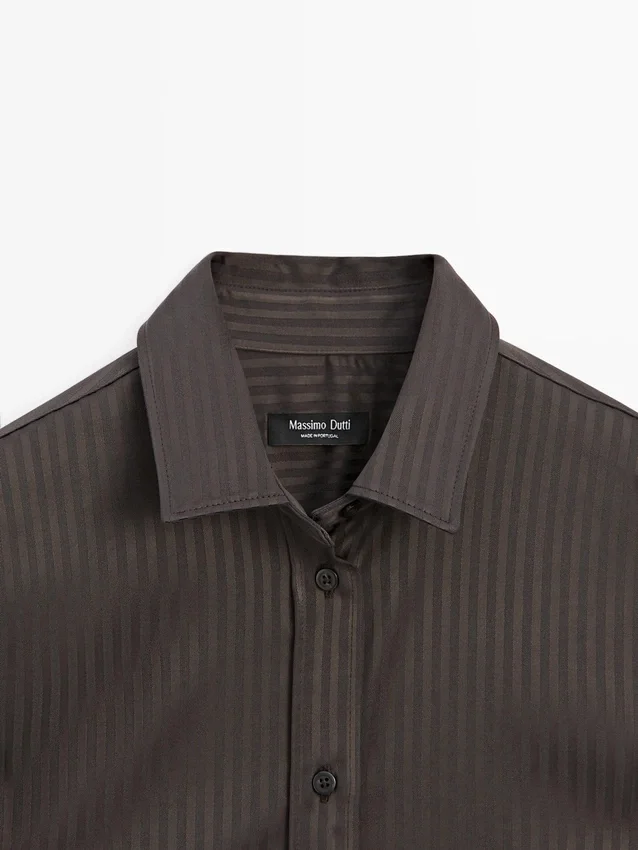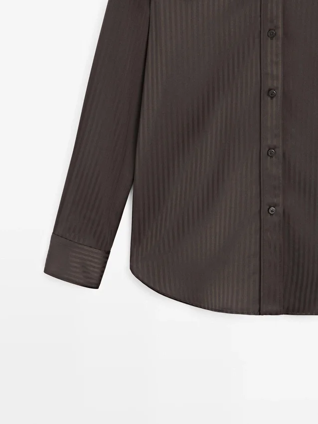Flowing Shirt. Long Sleeves with Buttoned Cuffs. Shirt Collar. Button-Up Front. Striped Detail.