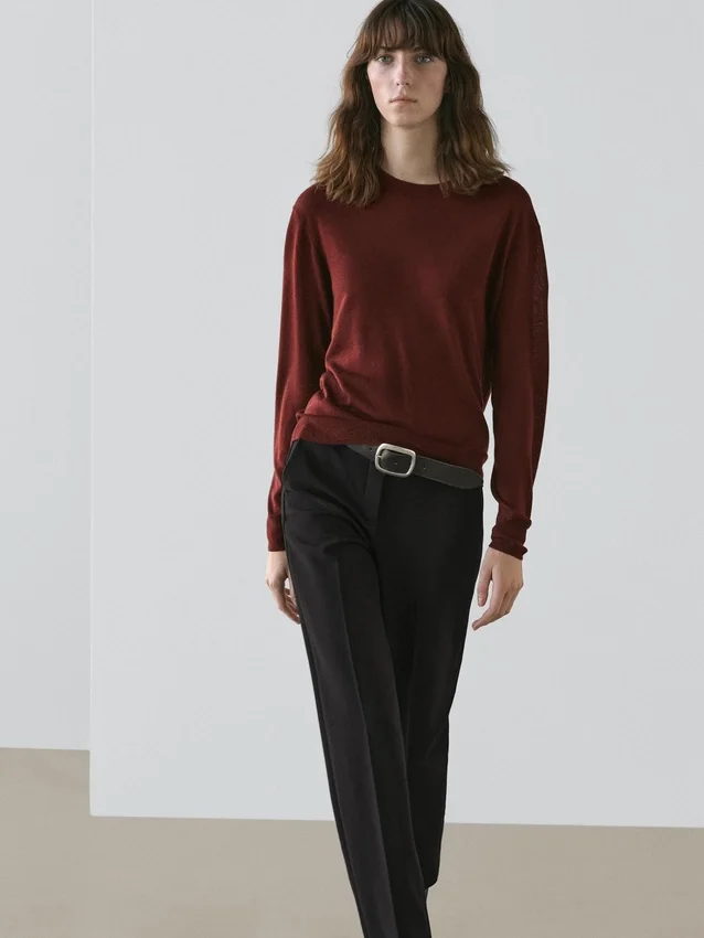 Fine Knit Sweater Made of Wool Fabric. Crew Neck. Long Sleeves. Ribbed Trims .