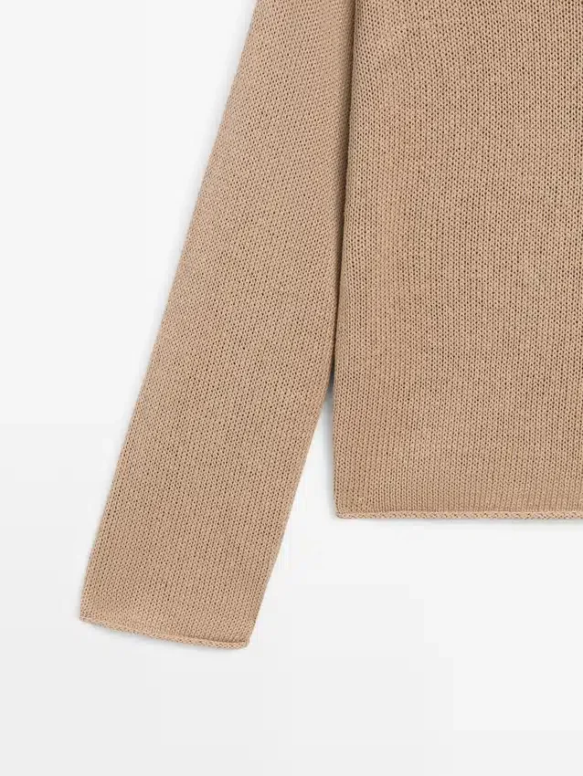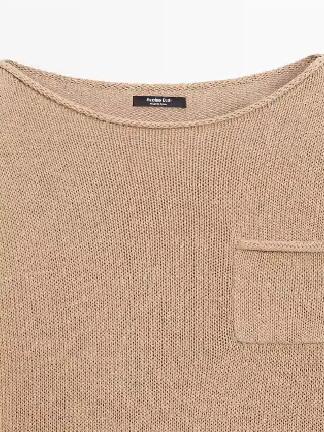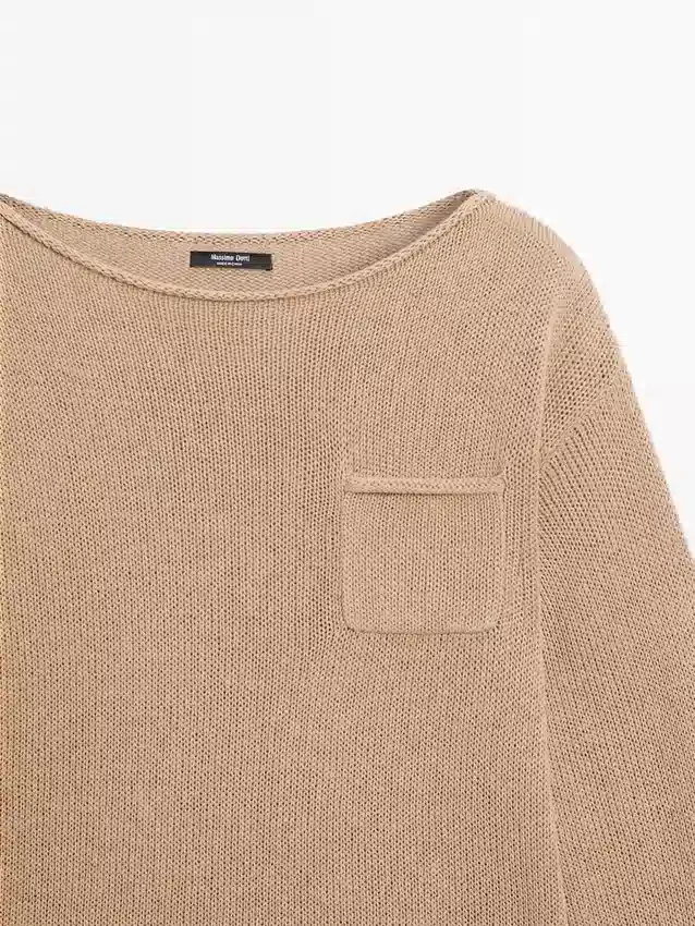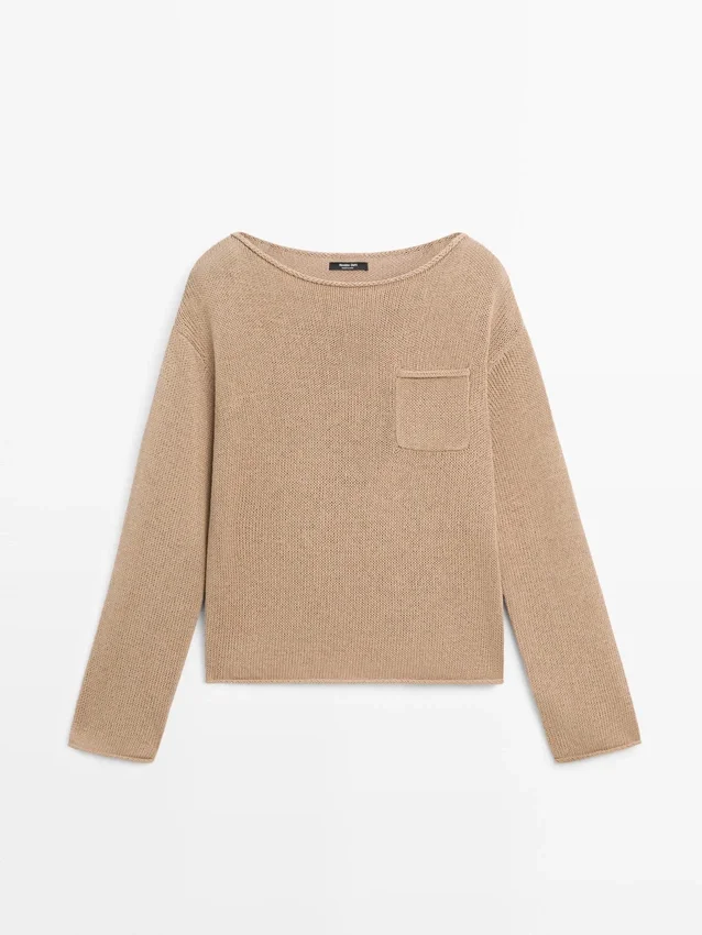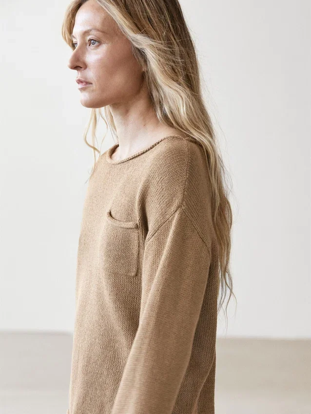 Sweater Made of Cotton and Linen Fabric. Boat Neck. Long Sleeves. Patch Pocket at the Chest.