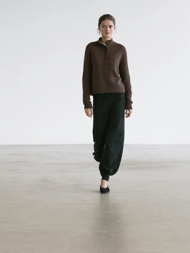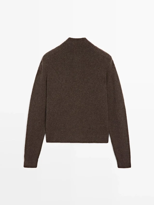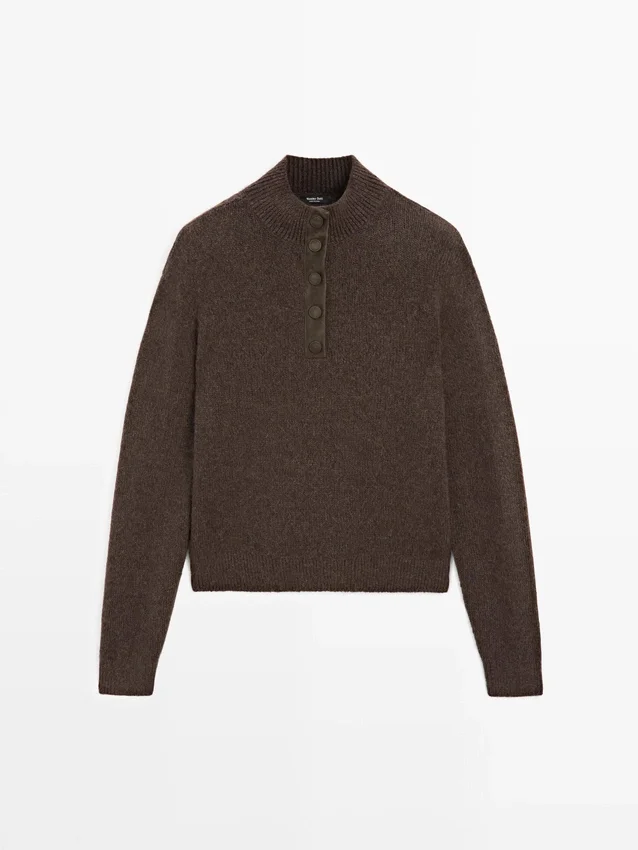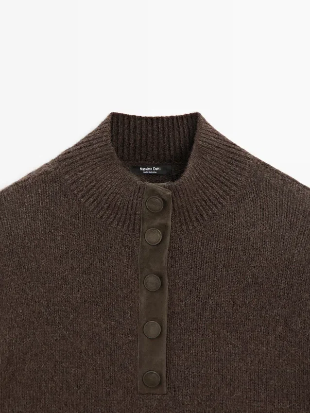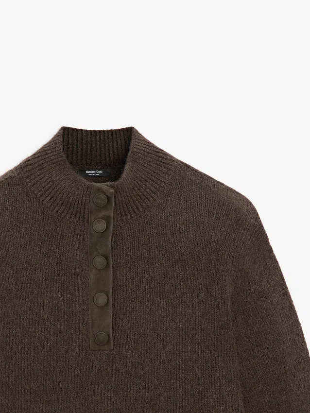 Sweater Made of Knit Fabric. Long Sleeves. Fastens with Snap Buttons. Buttoned-Up High Neck. Ribbed Trims . Goatskin Front Flap with a Suede Finish.