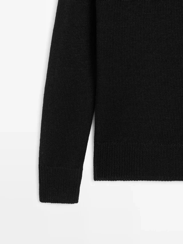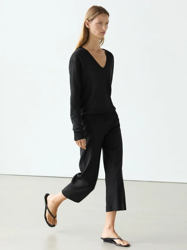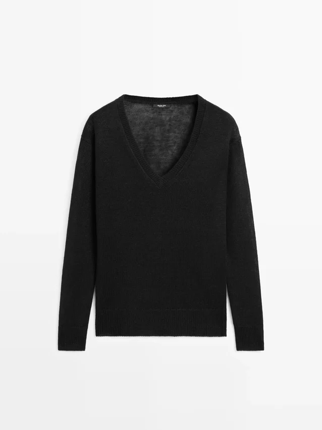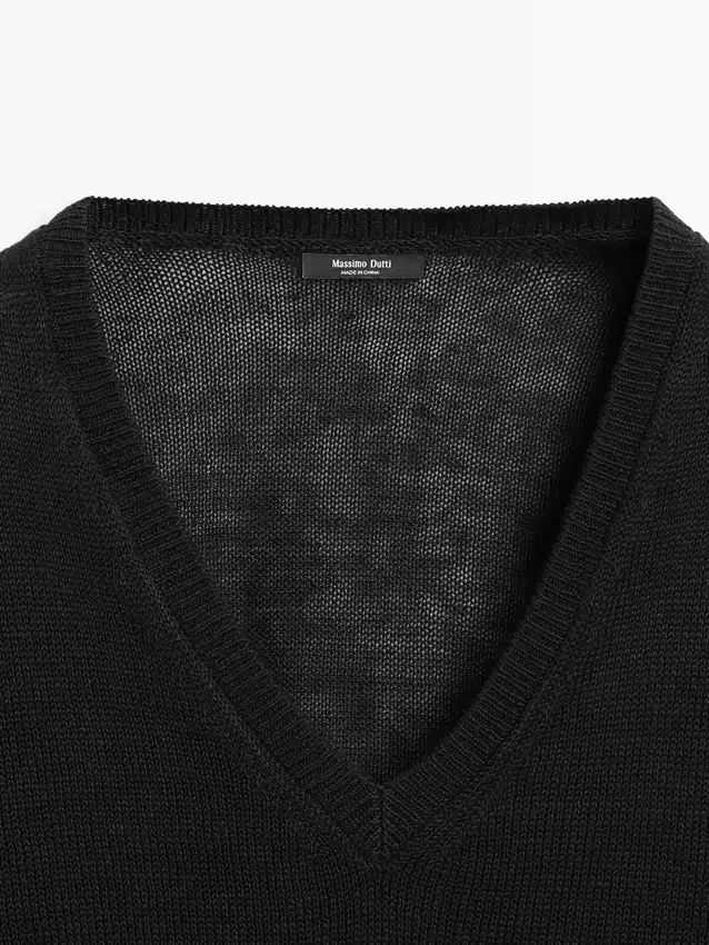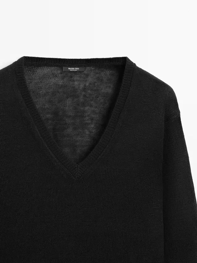 Knitted Sweater Made of Linen. V-Neck. Long Sleeves. Ribbed Trims .